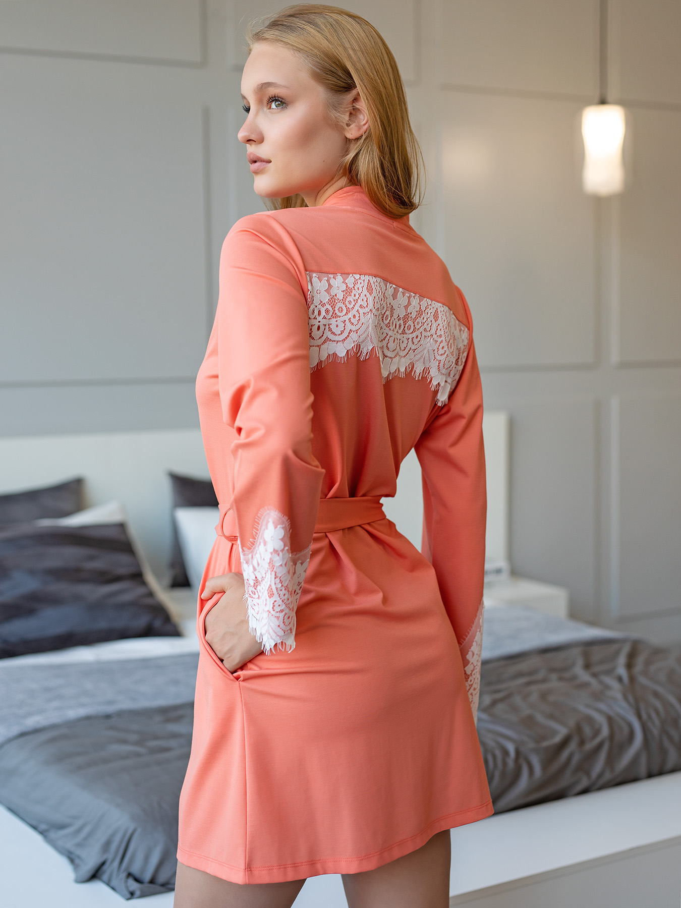 Женский нарядный халат для дома. Шикарное сочетание кораллового цвета и ажурного белого кружева с «ресничками» на его фоне смотрится потрясающе. Роскошный состав ткани (вискоза, тенсел, нейлон, полиамид) в правильном сочетании обеспечивает прекрасные тактильные свойства, износостойкость и красивый внешний вид. Халат на запАх, полочка поддерживается завязкой внутри, снаружи – мягким поясом. Удобные боковые карманы придутся очень кстати для разных мелочей. Рекомендуем дополнить лук брюками P-122 для законченного великолепного образа.