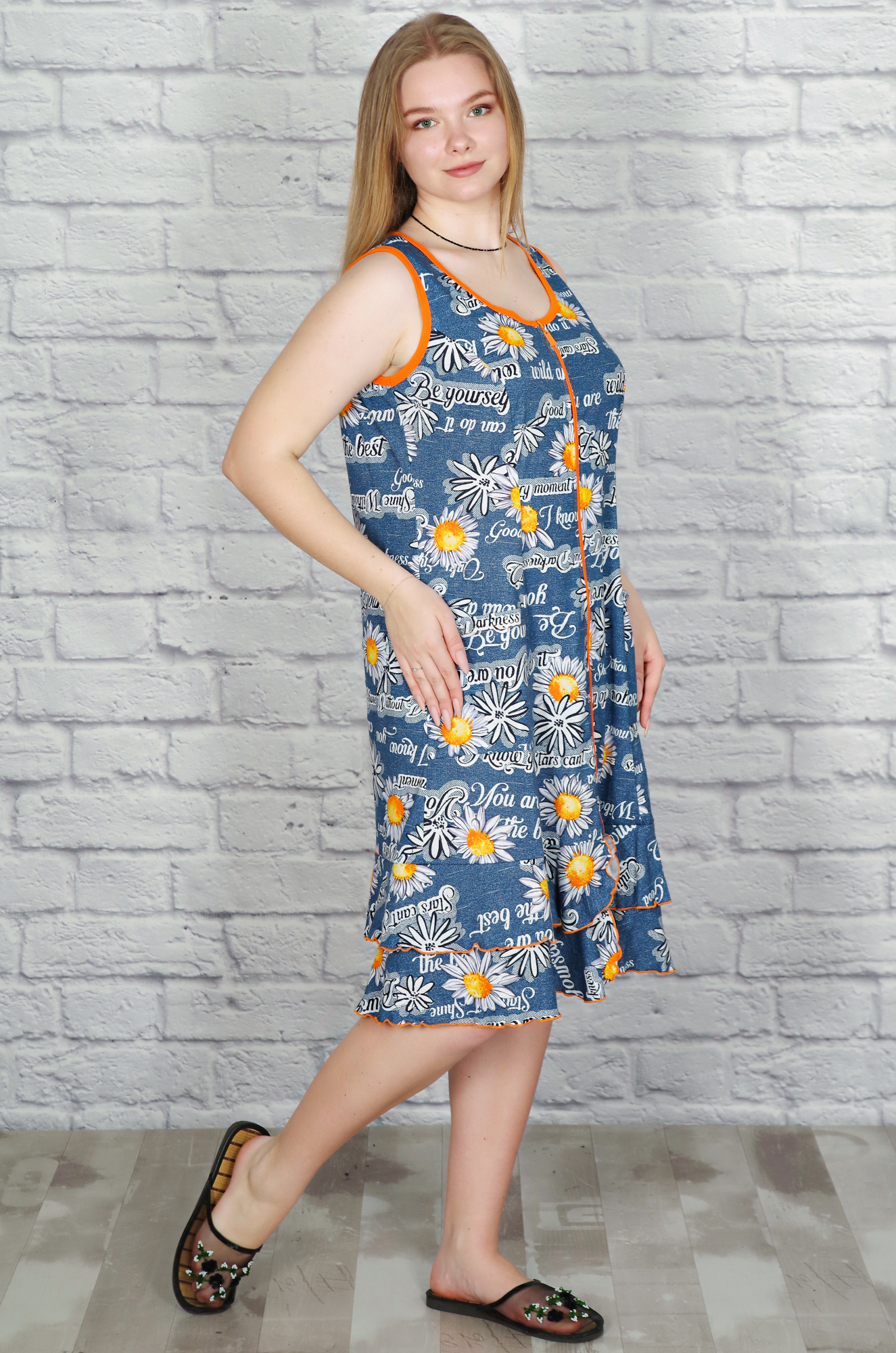 Летний хлопковый халатик на молнии. Модель на широкой бретели, с глубокими рельефными вытачками и накладными карманами, комфортная длина, по низу пришит пышный волан.
