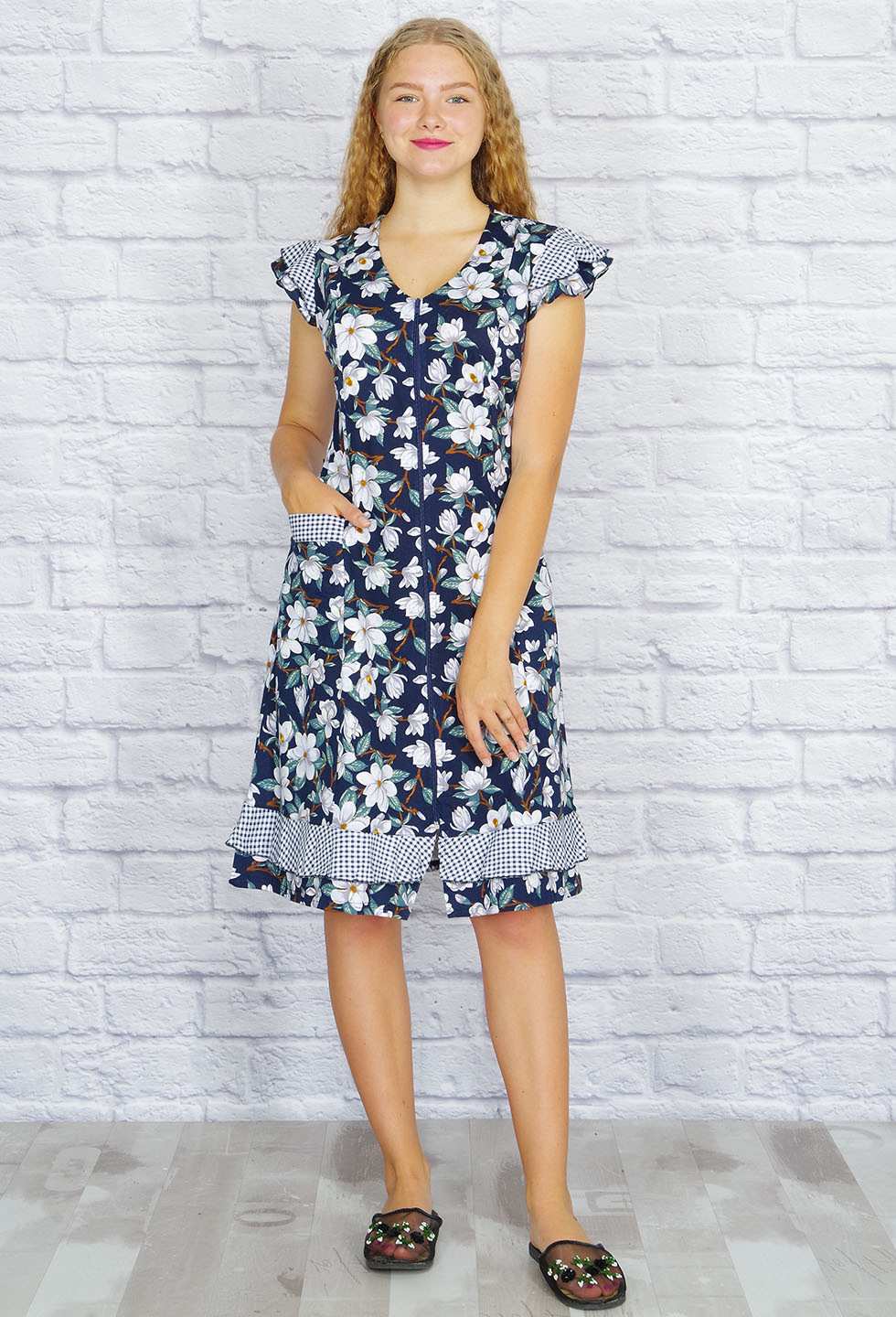 Симпатичный хлопковый домашний халатик на молнии с удобными накладными карманами, сзади тонкий поясок.