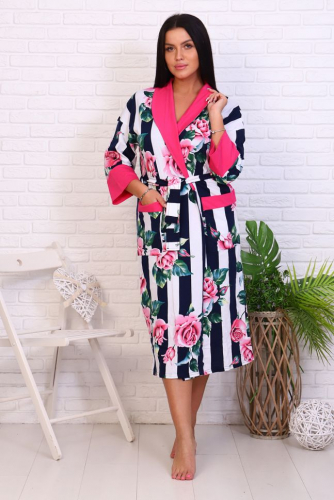 Оригинальный женский халат с красивым принтом на ткани в виде полос и роз. Застегивается на запах с поясом, длина ниже колена