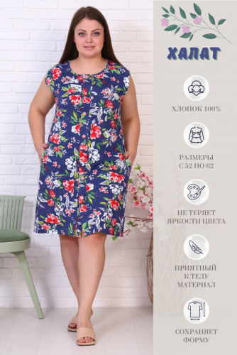 Ткань: кулирка; Состав: 100% хлопок; Сезонность: зима, весна, лето, осень; Рукав: короткий рукав; Стиль: домашний; Застежка: пуговицы; Карман: с карманами; Производство: г. Иваново, швейное производство НАТАЛИ; Тип изделия: халаты; Цвет: синий