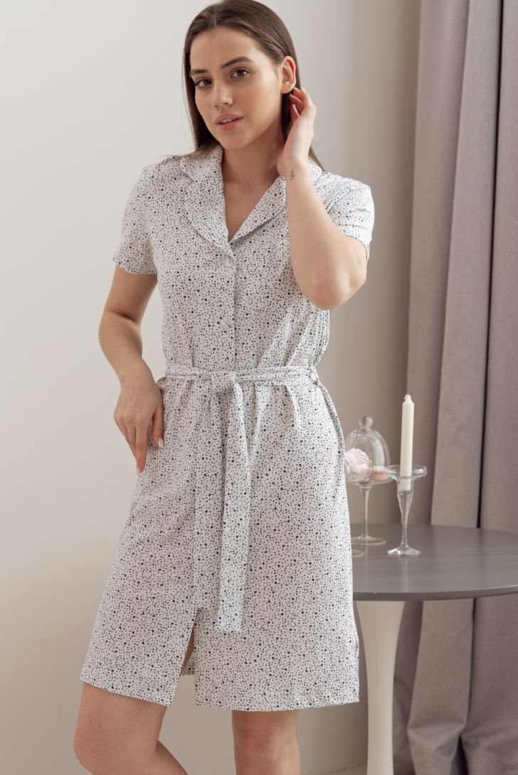 Халат-платье на пуговицах прямого свободного силуэта на поясе. Рукав короткий. Английский воротник с закругленными краями придает женственность образу. Халат декорирован накладным карманом на груди. Два цветовых решения. Бело-синий