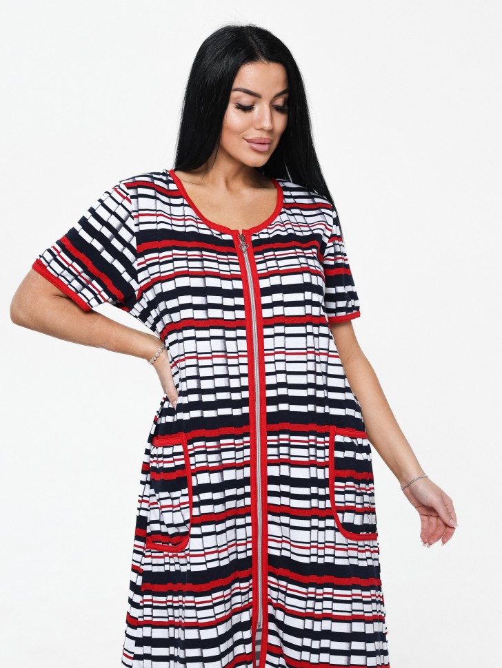 Халат женский на молнии, короткий рукав, накладные карманы. Состав полотна 100% хлопок ( набивное кулирное полотно). Размеры:50,52,54,56,58,60,62,64,66,68