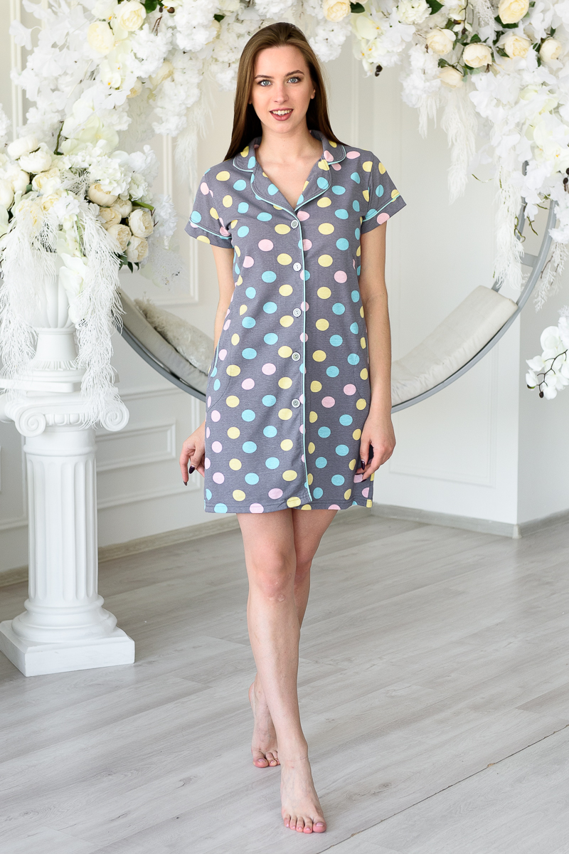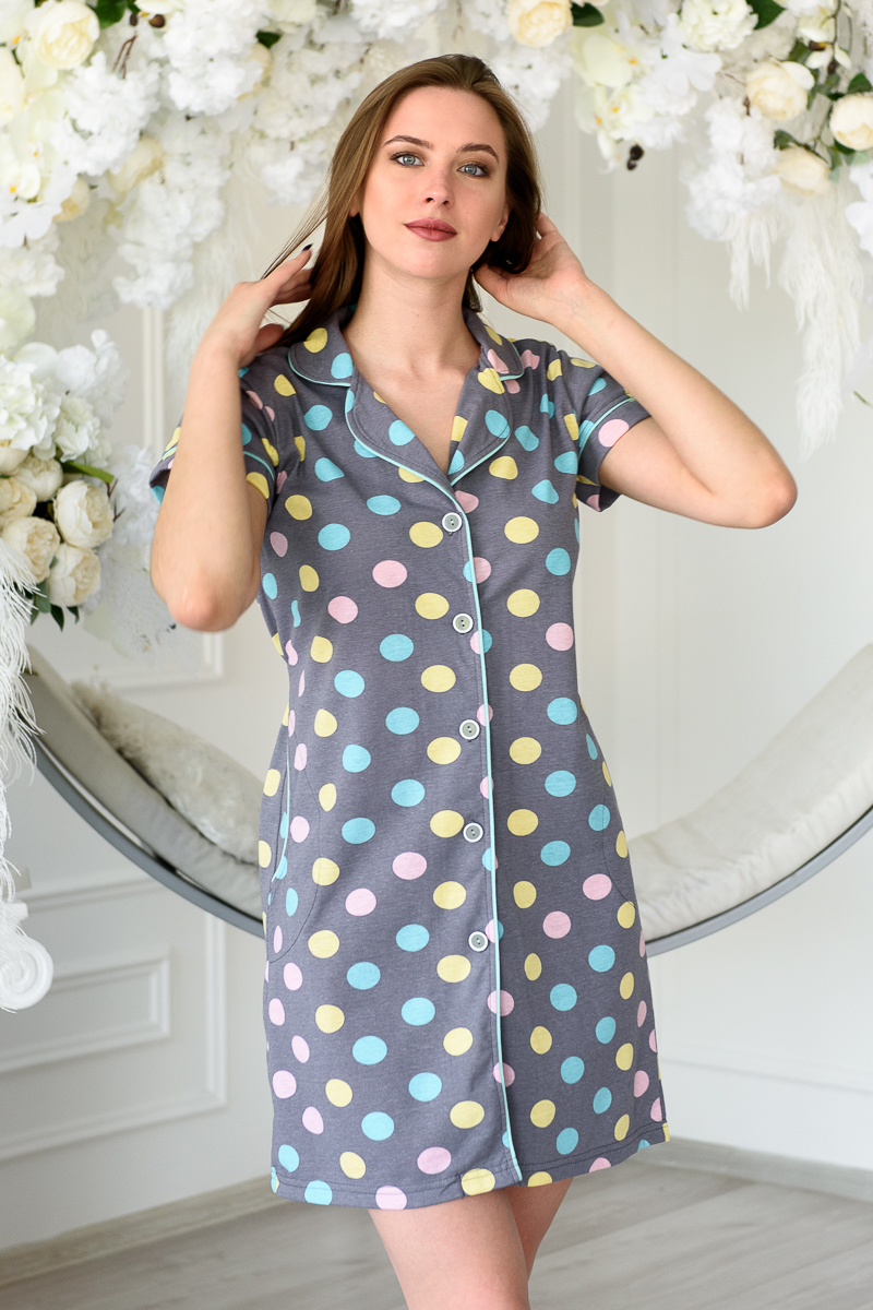 Халат женский из кулирки с коротким рукавом и кантом Саманта цветной горох на сером