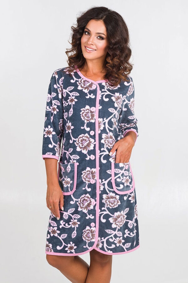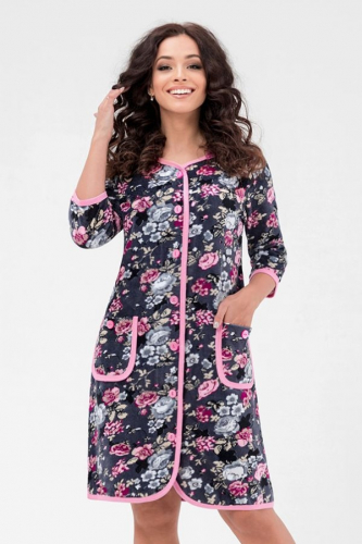Цвет: пионы на сером фоне Яркий домашний халат на пуговицах и рукавом 3/4 — один из самых практичных вариантов для комфортного занятия домашними делами. Эта модель из уютного набивного велюра прекрасно подойдет для отдыха дома и на даче. Яркая расцветка всегда актуальна для любого сезона. Широкий размерный ряд включает размеры для обладательниц SIZE PLUS. Стильный и легкий, он подойдет любому типу фигуры, в том числе беременным и кормящим мамам. TM Serenada, женская одежда от производителя. Сделано в России на собственном производстве