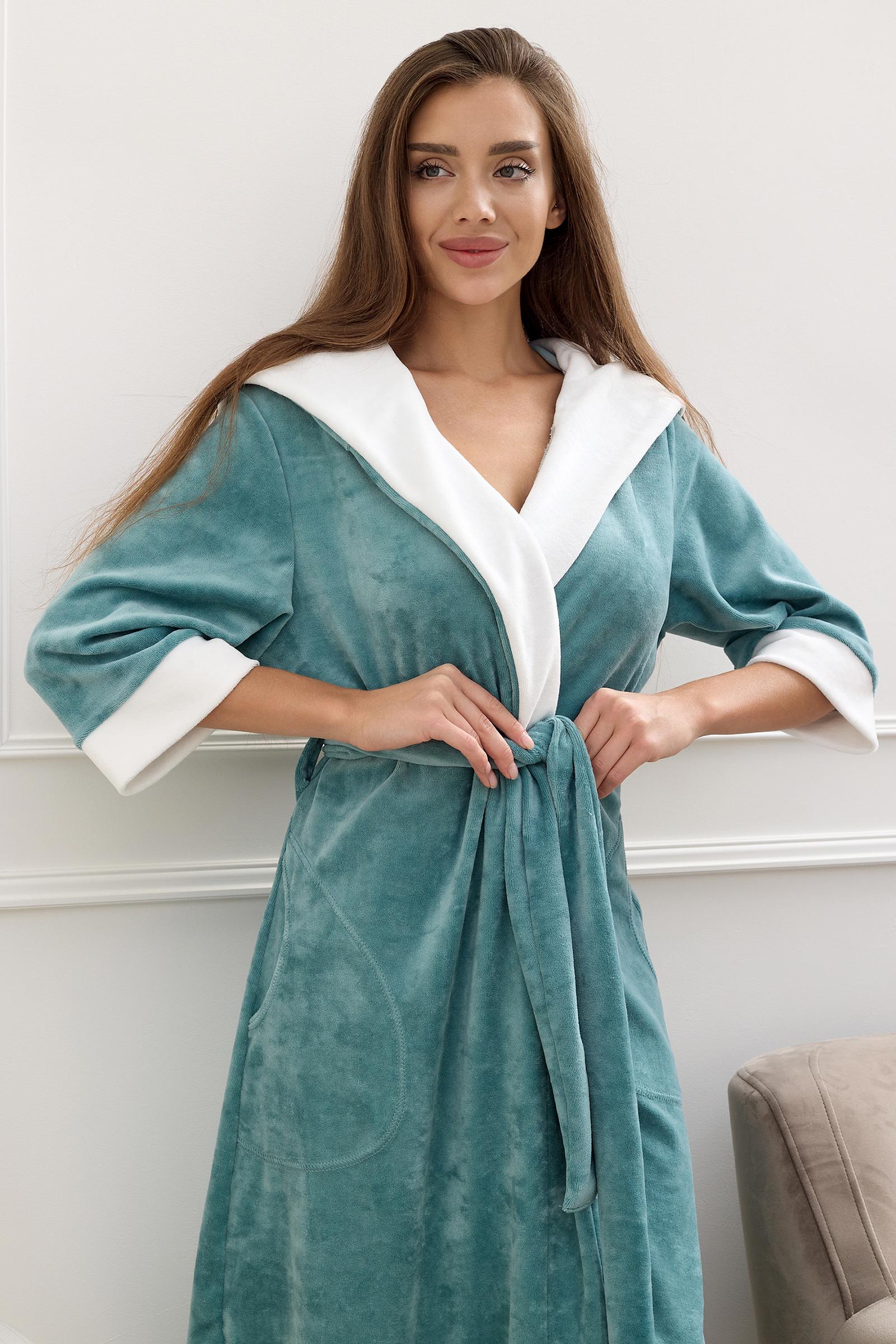 Мягкий велюровый халат Ника для уютных вечеров и отдыха. Может служить как банный женский халат, отлично впитывает влагу и сохраняет тепло. Комфортная длина ниже колена, большие карманы, длинные рукава, делают модель универсальной. Халат может быть отличным подарком на юбилей или другой праздник.