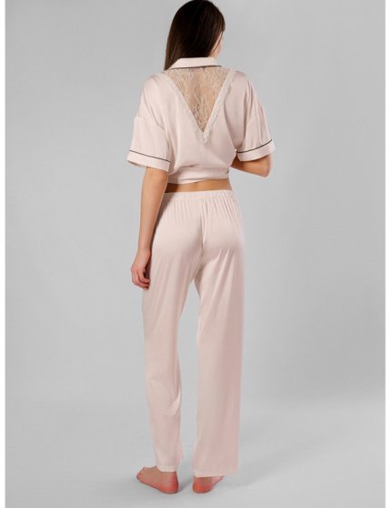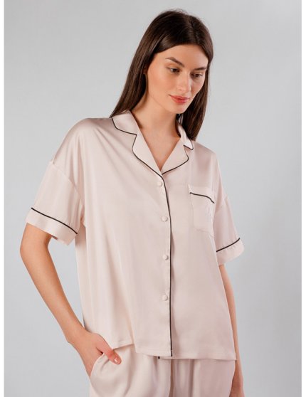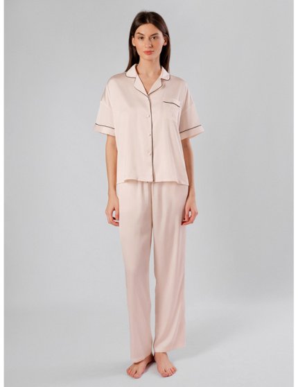 Оптовая продажа. Пижама женская кремового цвета из легкого полиэстера, состоящая из рубашки и брюк. Рубашка прямая, свободного кроя, с короткими рукавами, отложным воротником, обрамлением, нагрудным кармашком, украшенным стразами, центральной застежкой на пуговки. Брюки прямые, свободного кроя, с боковыми карманами. Пояс на удобной мягкой резинке.