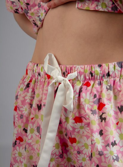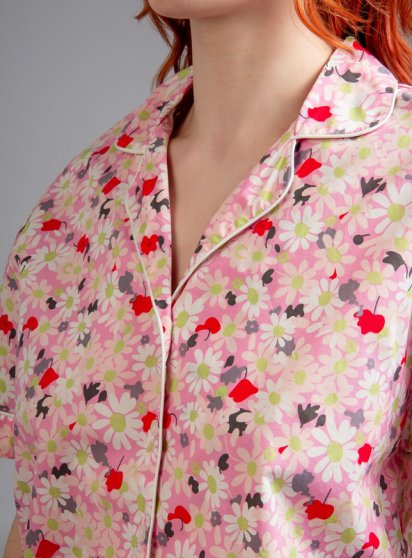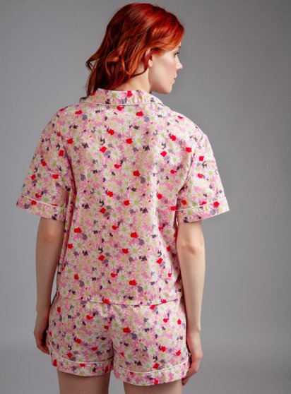 Оптовая продажа. Пижама женская из высококачественного хлопка розового цвета, с цветочным принтом по всему полотну, состоящая из рубашки и шорт. Рубашка прямая, свободного кроя, укороченная, с короткими втачными рукавами, воротником-отворотом, с обрамлением, центральной застежкой на пуговки. Шорты прямые, свободного кроя, укороченные, пояс на мягкой эластичной резинке, обеспечивающий удобство и свободу движений во время носки, надежно фиксируясь на теле, с регулирующей лентой. Изделия из натурального хлопка подходят для чувствительной кожи.