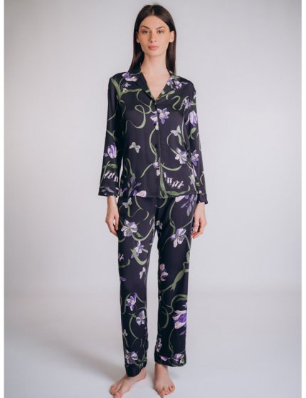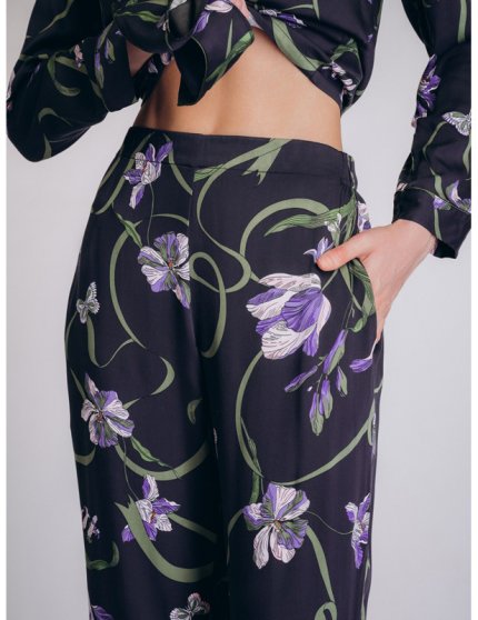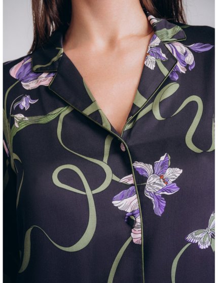 Оптовая продажа. Пижама женская с цветочным рисунком, из мягкого вискозного полотна, состоящая из рубашки и брюк. Рубашка прямая, свободного кроя, с длинными рукавами, украшенными прошитыми заворотами. На рубашке расположены тканевые пуговицы, которые добавляют элегантности. Край рубашки и воротник декорированы тонкой зелёной оборкой. Брюки прямые, свободного кроя, с прошитыми заворотами, обеспечивающими аккуратный вид, боковыми наклонными карманами Пояс выполнен из эластичной резинки, что гарантирует удобную посадку.