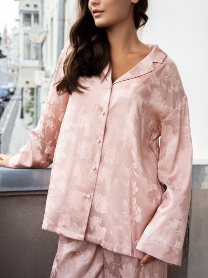 Оптовая продажа. Пижама женская бежево-розового цвета с цветочным жаккардовым рисунком, из высококачественного вискозного полотна, состоящая из рубашки и брюк. Рубашка прямая, свободного кроя, с длинными рукавами, воротником отворотом, центральной застежкой на пуговки. Брюки прямые, свободного кроя, пояс на мягкой эластичной резинке для максимального комфорта.