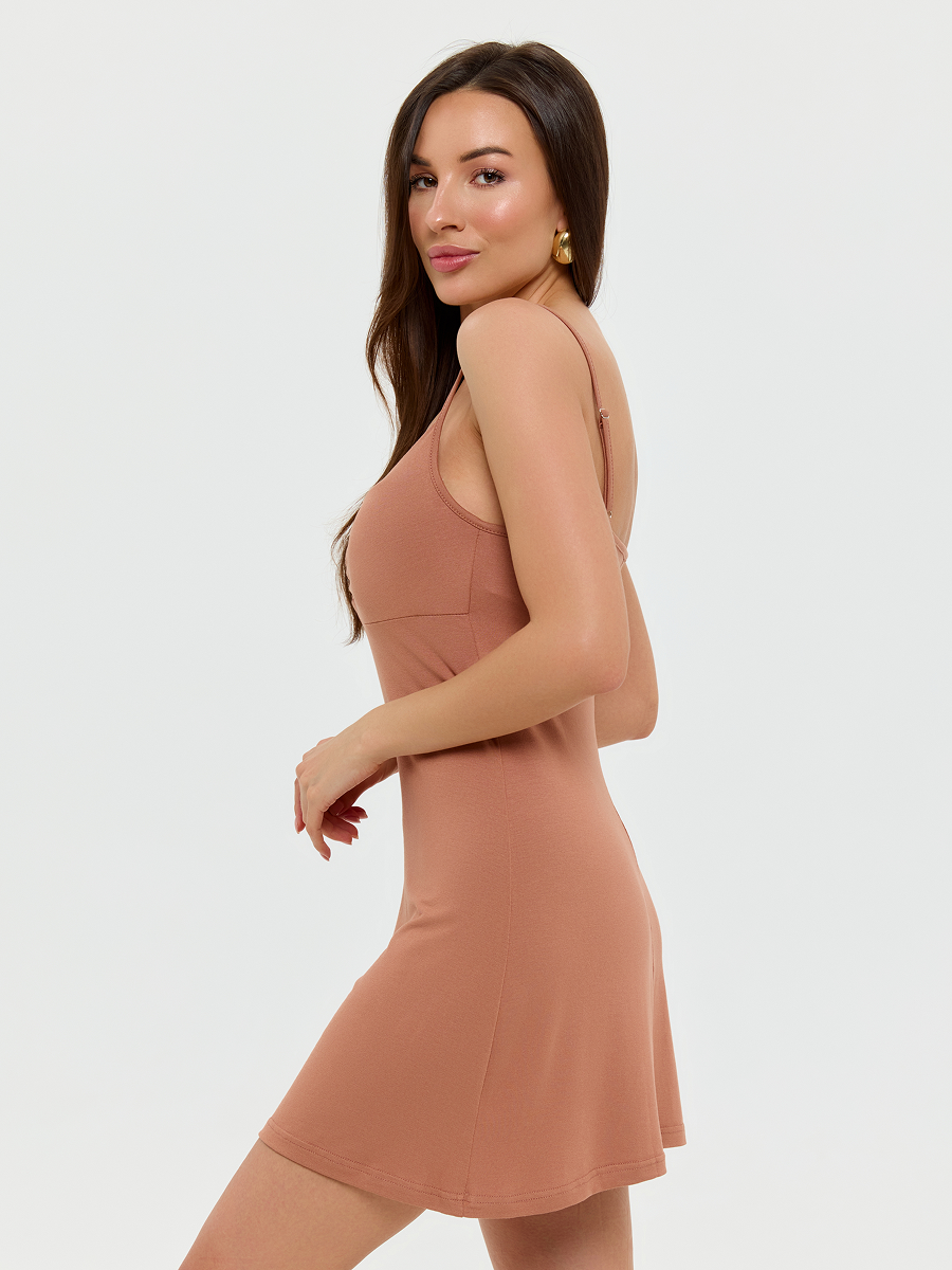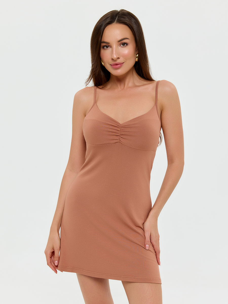 Вискозная сорочка с регулируемой бретелью и горизонтальным швом под грудью. Лиф полочки двойной со сборкой по центральному шву, спинка с средним швом, по низу подгибка. Качественная вискоза обеспечивает удобство в носке и приятное облегание по телу. Цвет: карамель; Материал: вискоза;вискоза; Состав: 92% вискоза, 8% эластан.
