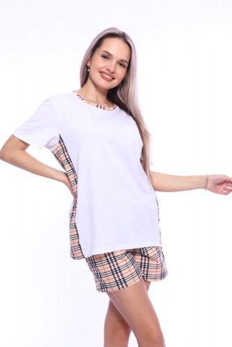 Пижама женская из 100% хлопка для сна и отдыха, состоящая из майки с V-образным вырезом и печатным рисунком на груди. Клетчатые шорты средней длины и объемности со складкой спереди и поясом на резинке, карманы в боковых швах.