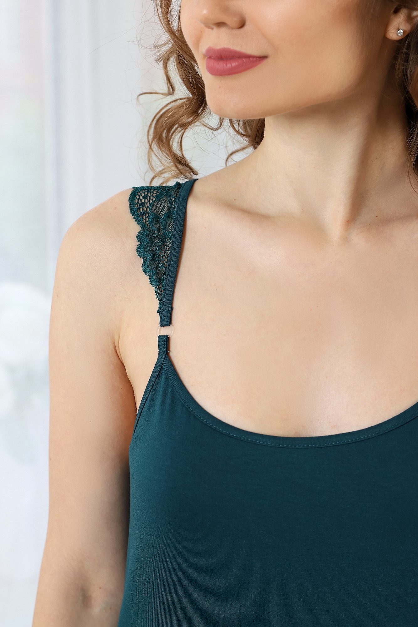 Сорочка молодежная из гладкокрашенного вискозного полотна, слегка расширенная книзу, с горловиной овальной формы, без рукавов на бретелях. Горловина и проймы окантованы основным материалом, детали бретелей выкроены из кружева, низ изделия отделан кружевом.