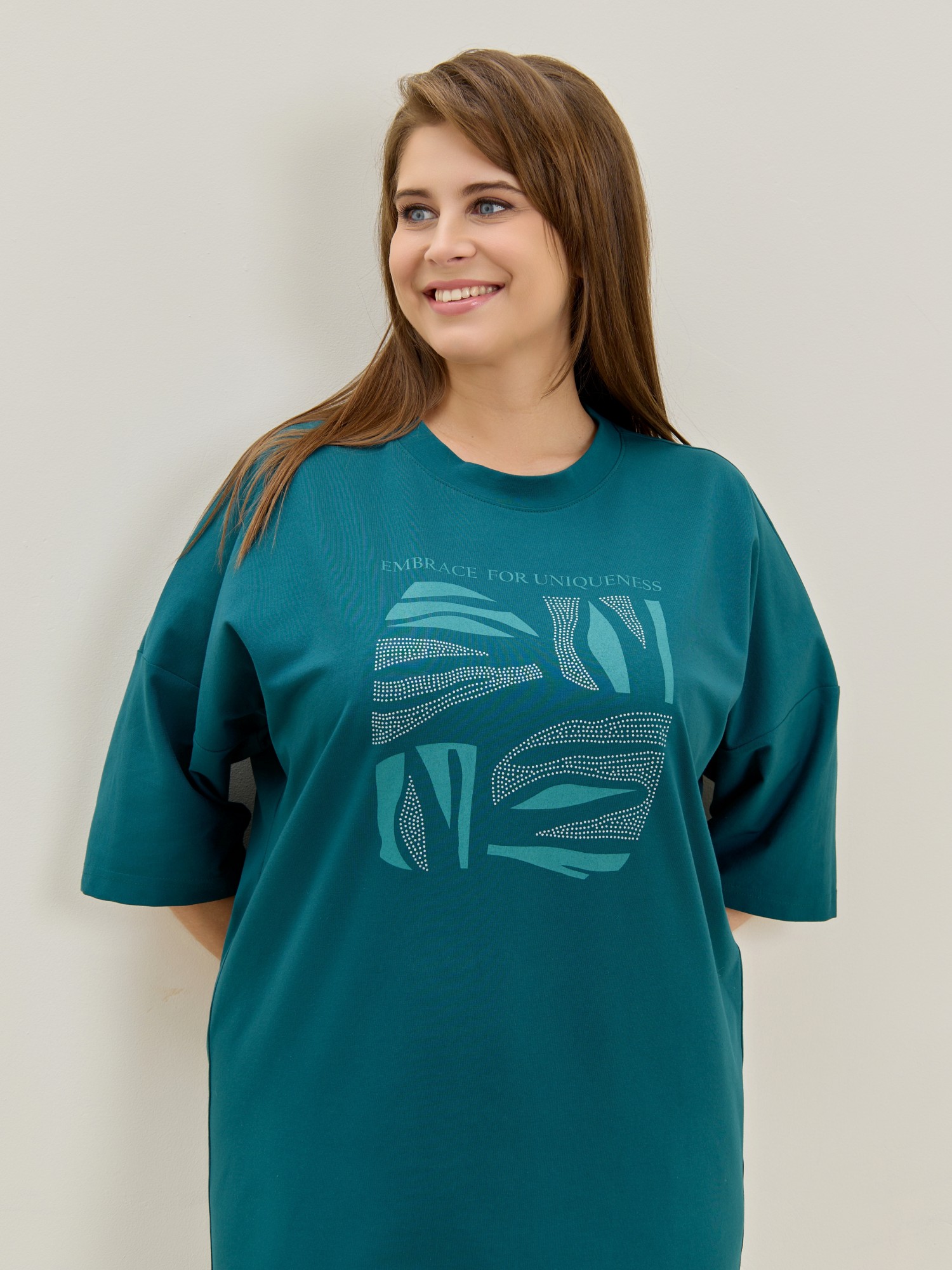 Туника женская из гладкокрашенного полотна «кулирка» с лайкрой, свободного покроя, с втачными рукавами длиной до локтя, горловиной овальной формы, обработанной втачной планкой и разрезами в боковых швах. На полочке принт, выполненный в технике «шелкографии».