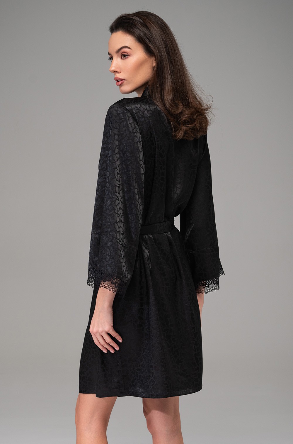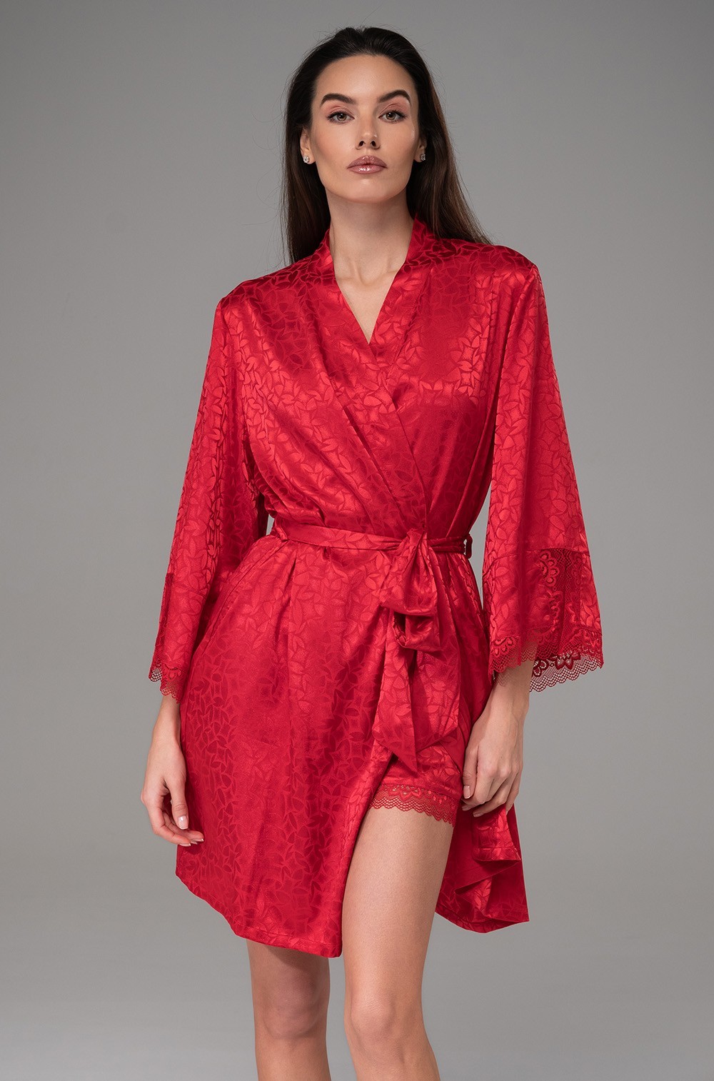 Короткий запашной халат-кимоно Mia-Amore с широкими рукавами длиной ¾. Халат выполнен из однотонного искусственного шелка на жаккардовой основе. Низ рукавов украшен ажурным кружевом. В боковых швах расположены карманы. Линия талии подчеркивается за счет широкого пояса.