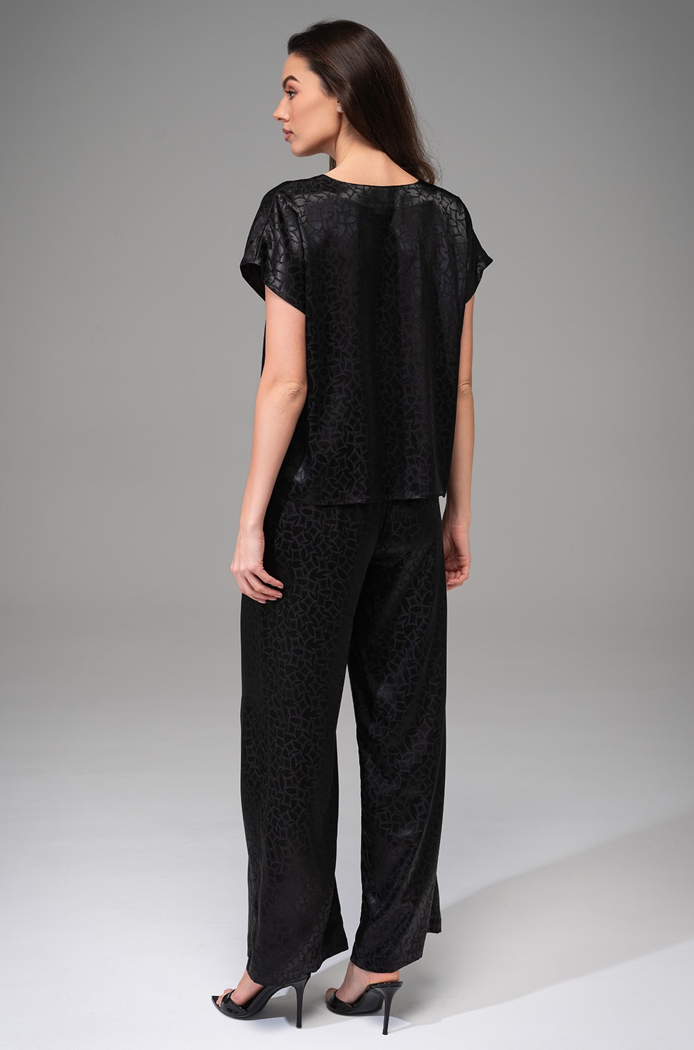 Элегантный комплект Mia-Amore состоит из топа свободного силуэта и широких брюк. Данный сет выполнен из однотонного искусственного шелка на жаккардовой основе. В боковых швах брюк расположены карманы.