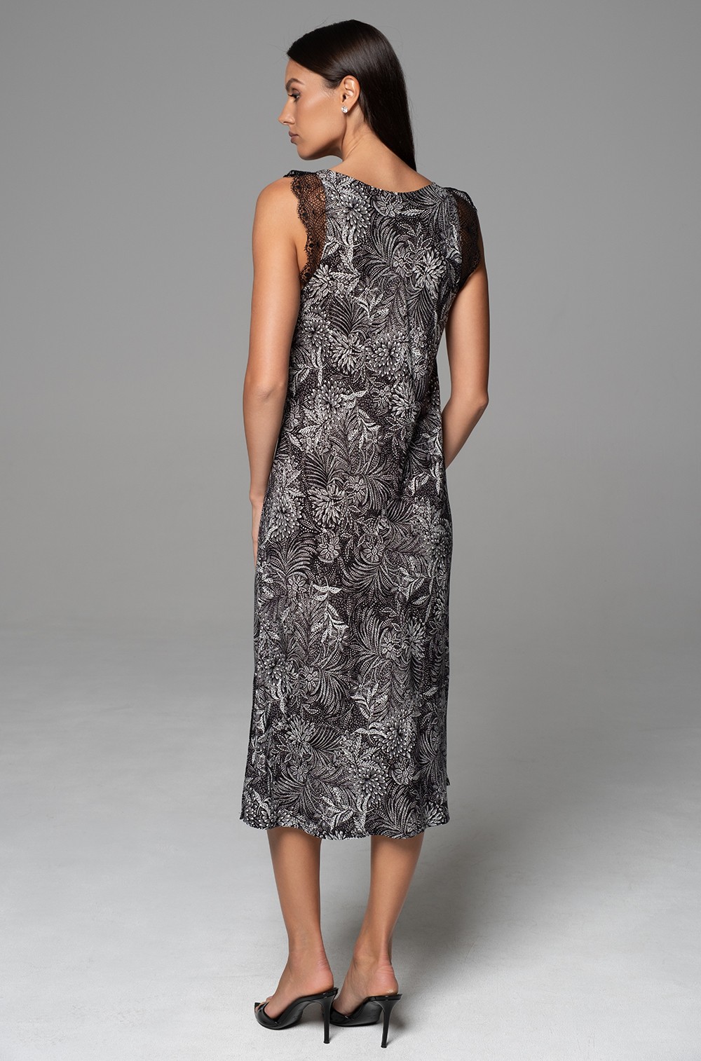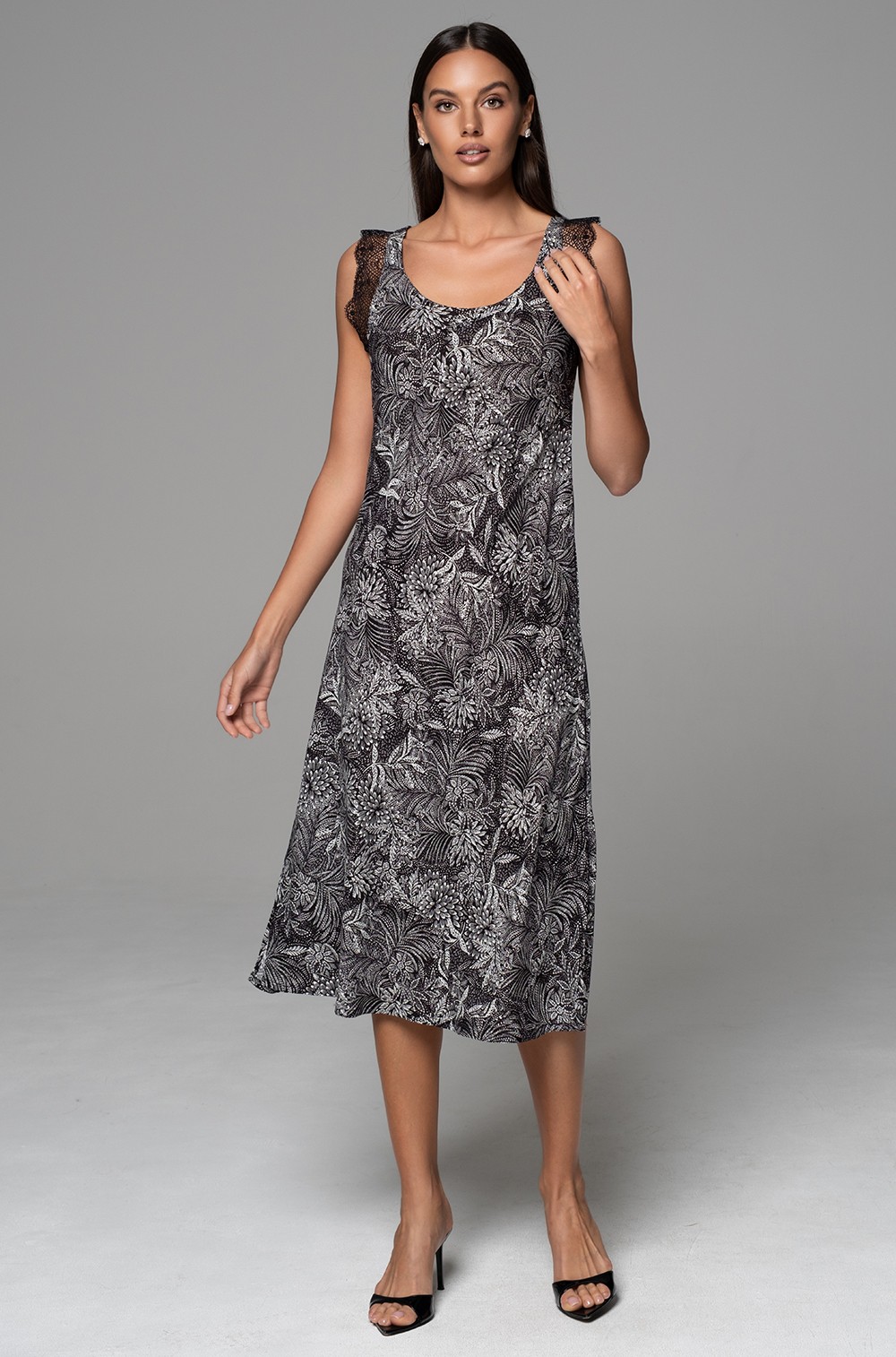 Длинная элегантная сорочка Mia-Amore на широких бретелях, без подреза под грудью, полуприлегающего силуэта. Изделие выполнено из тканой принтованной вискозы с кружевными вставками по проймам. По низу боковых швов расположены разрезы для свободы движения.