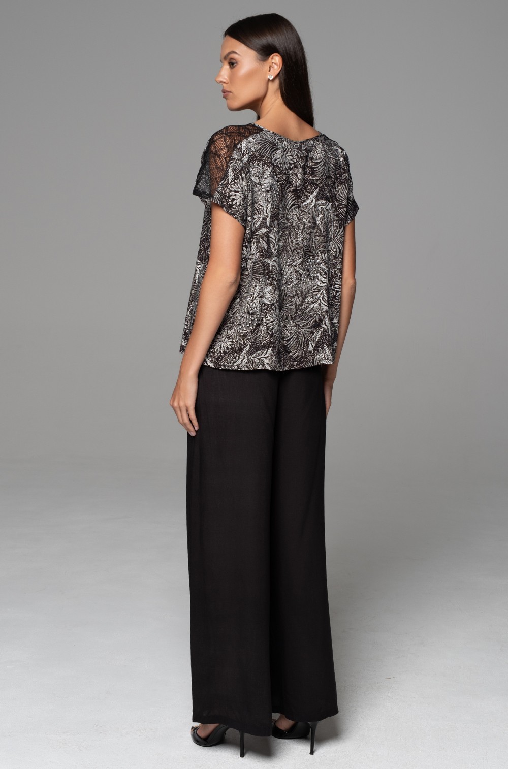 Комплект Mia-Amore состоит из топа свободного силуэта с коротким рукавом и широких брюк - палаццо. Топ выполнен из принтованной вискозы с кружевными вставками по линии плеча, брюки полностью выполнены из однотонной вискозы.