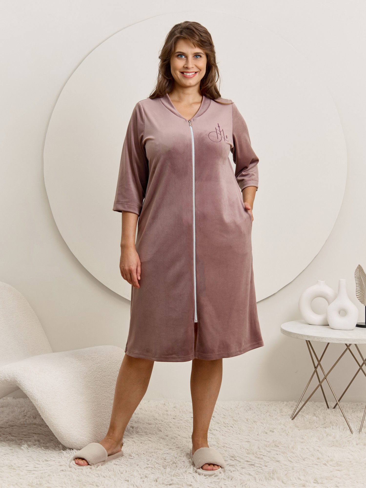 Халат женский из гладкокрашенного трикотажного полотна «велюр стрейч», прямого силуэта, с втачными рукавами длиной ¾ и карманами в боковых швах. Горловина v-образной формы обработана втачной планкой, переходящей в центральную бортовую застежку на тесьму «молния», на левой полочке печать, выполненная в технике «шелкографии».