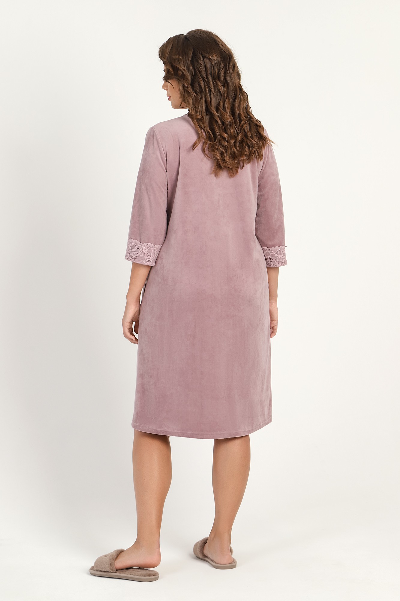 Халат женский из трикотажного полотна «вельмонд», прямого силуэта, с втачными рукавами длиной ¾, карманами в боковых швах, горловиной v-образной формы, переходящей в центральную бортовую застежку на тесьму «молния», с вышивкой на левой полочке и отделкой широким кружевом по низу рукавов.