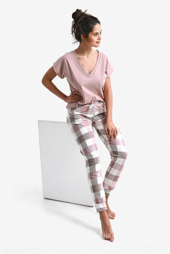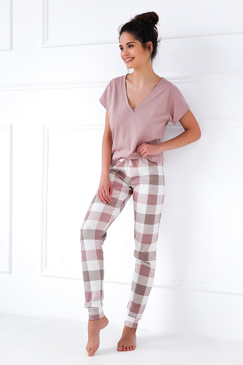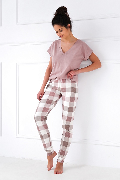 Пижама Netty состоит из футболки с глубоким треугольным вырезом и зауженных брюк в клетку. Элемент декора - бантик на резинке брюк. Идеальный вариант не только для сна, но и для домашнего отдыха.