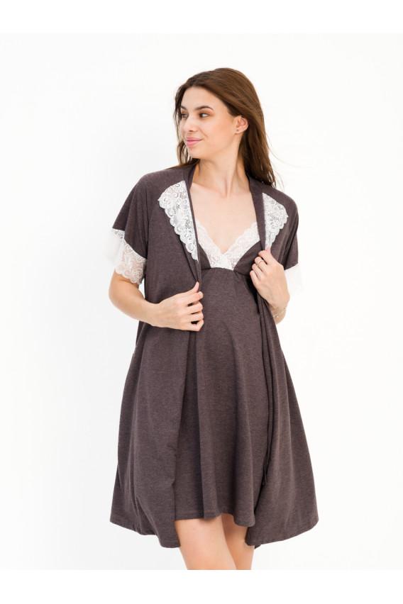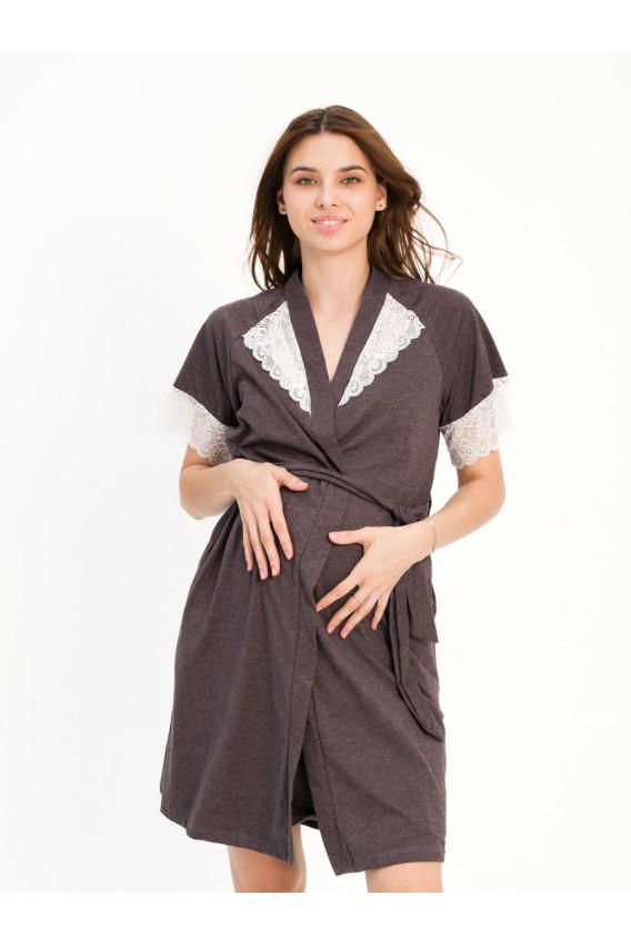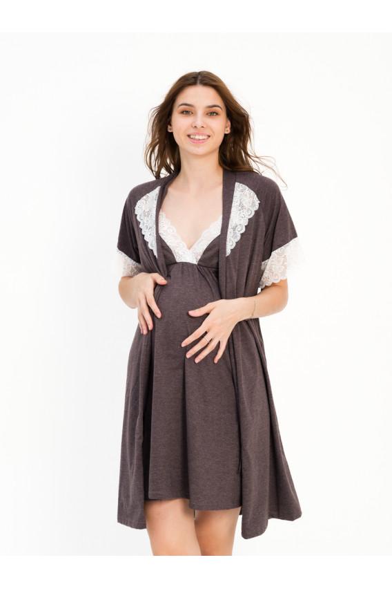 Описание: Сорочка с элегантным декорированным кружевом вырезом. Халат на запах с поясом. Комплект можно взять с собой в роддом. В нем Вы будете чувствовать себя комфортно в период беременности, кормления и после окончания периода кормления.