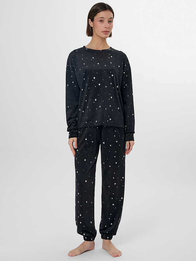 Комплект состоит из джемпера и брюк. Джемпер прямого силуэта. Горловина круглой формы, обработана обтачкой из основного полотна. Линия плеча спущена. Рукава длинные втачные . По низу рукавов отрезные манжеты из основного полотна. Низ джемпера обработан швом в подгибку на плоскошовной машине. Брюки прямые, свободные. Пояс цельнокроеный с эластичной тесьмой внутри (внутр. 40мм 40RV). По низу в шве подгибки эластичная тесьма (внутр. 30мм 30RV).