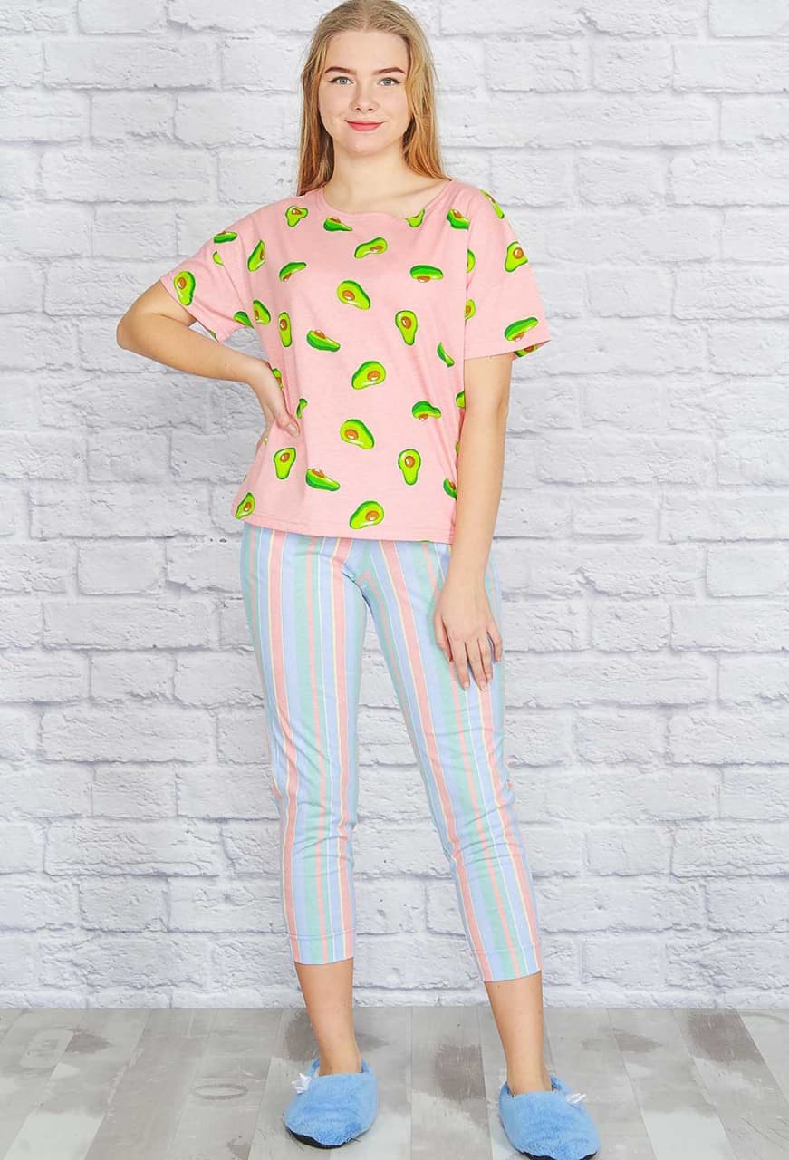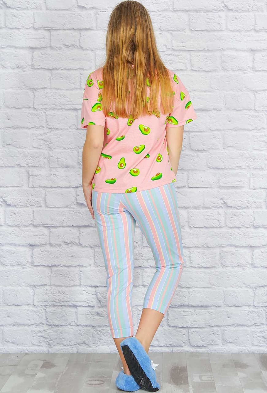 Удобный и стильный хлопковый костюм, который должен быть в домашнем гардеробе каждой девушки! Популярный принт "Авокадо" прочно "вошёл в нашу жизнь". Футболка свободная, прямого кроя, рукав со спущенным плечом и зауженные удлинённые бриджи с боковыми карманами, пояс на резинке.
