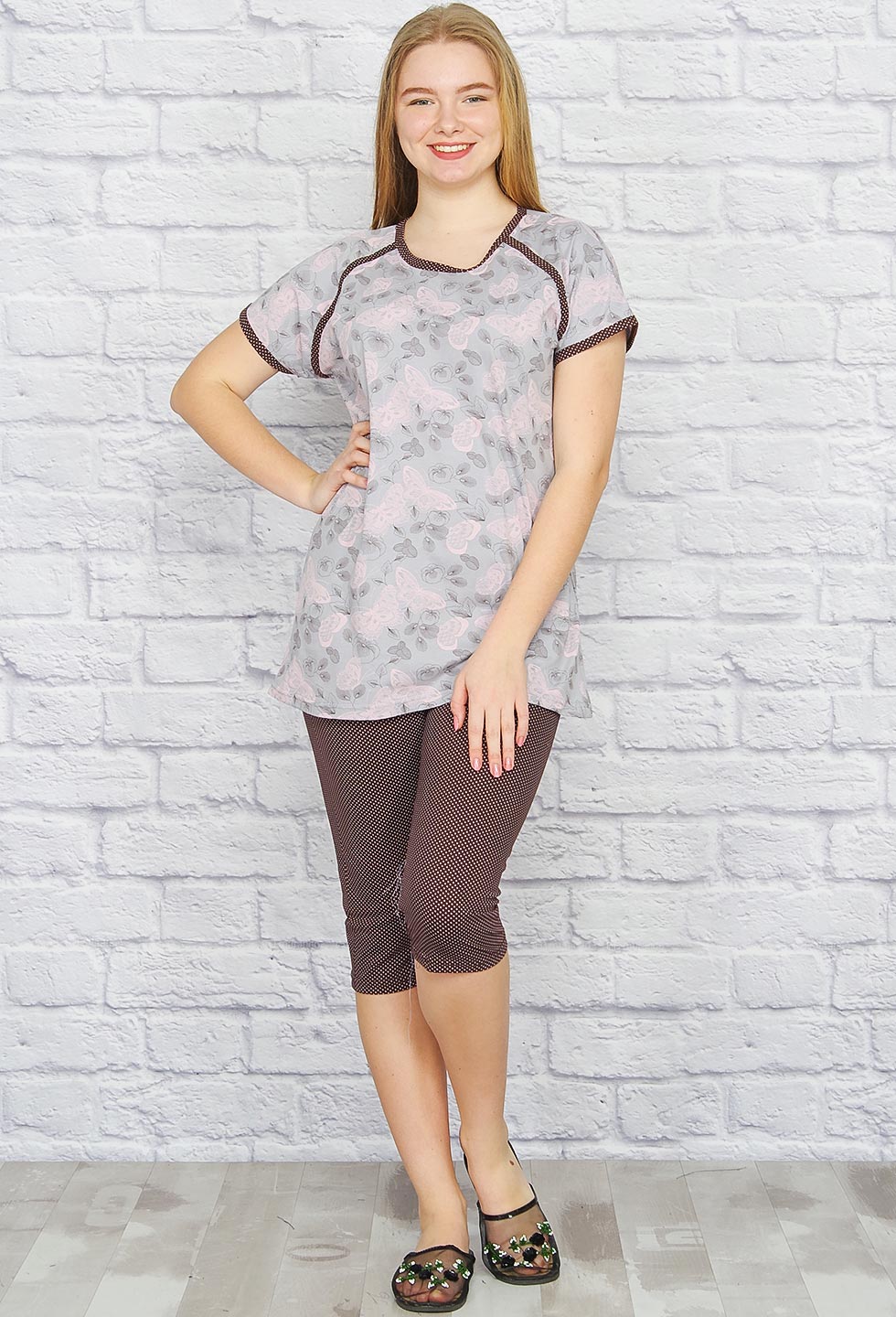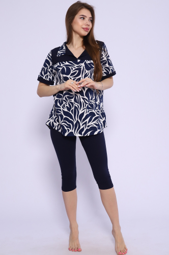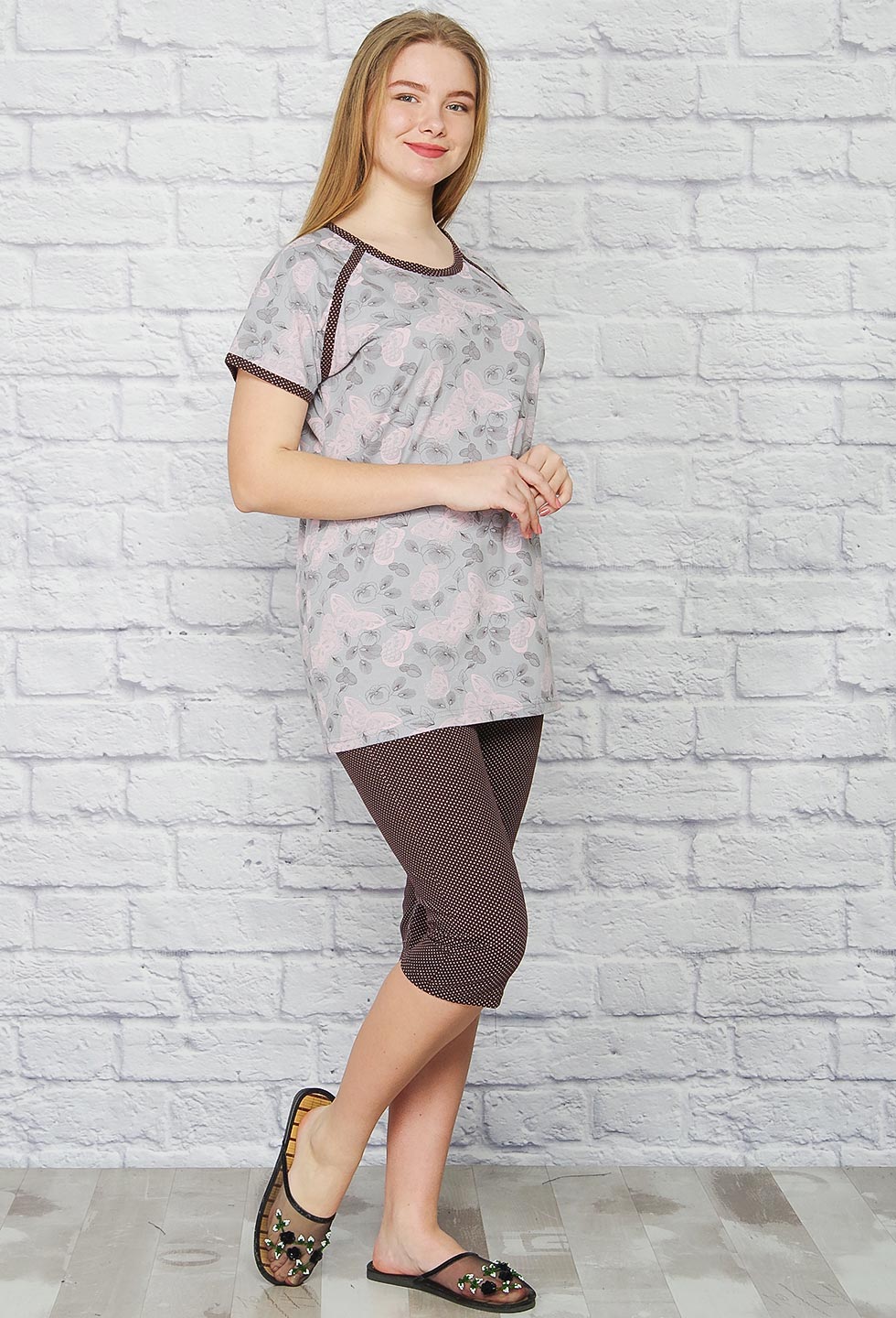 Удобный домашний костюмчик. Футболка прямого кроя, горловина, плечевой шов и рукава окантованы. Бриджи облегающие, пояс на резинке.