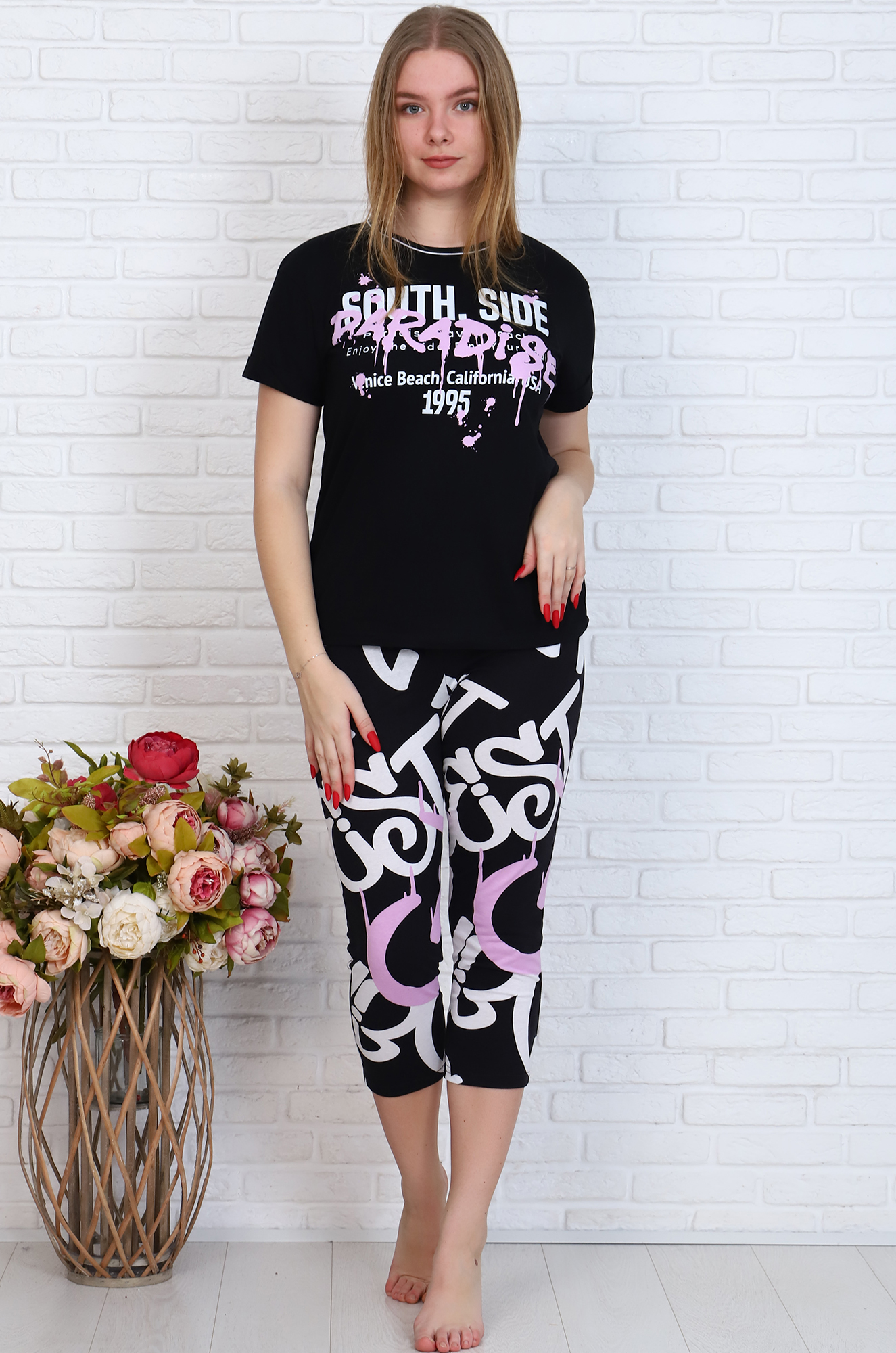 Очень симпатичный и комфортный домашний костюм для современных женщин. Футболка классического прямого кроя, рукав с подворотом, на полочке тематический печатный принт. Бриджи облегающего кроя, пояс на резинке, удобные боковые карманы.