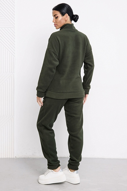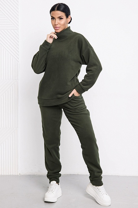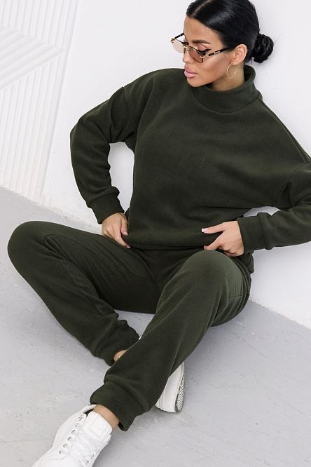 Женский костюм из флиса состоит из лонгслива и брюк, выполненных в едином стиле. Лонгслив имеет удобный свободный крой, воротник-стойку, которая обеспечивает защиту от холода и ветра. Брюки выполнены с учетом анатомических особенностей женской фигуры, имеют удобные манжеты на лодыжках и пояс на резинке для оптимальной посадки. Также предусмотрены боковые карманы для хранения мелких предметов. Хаки