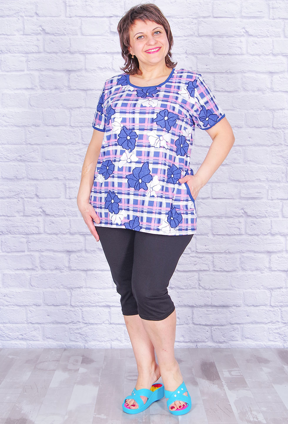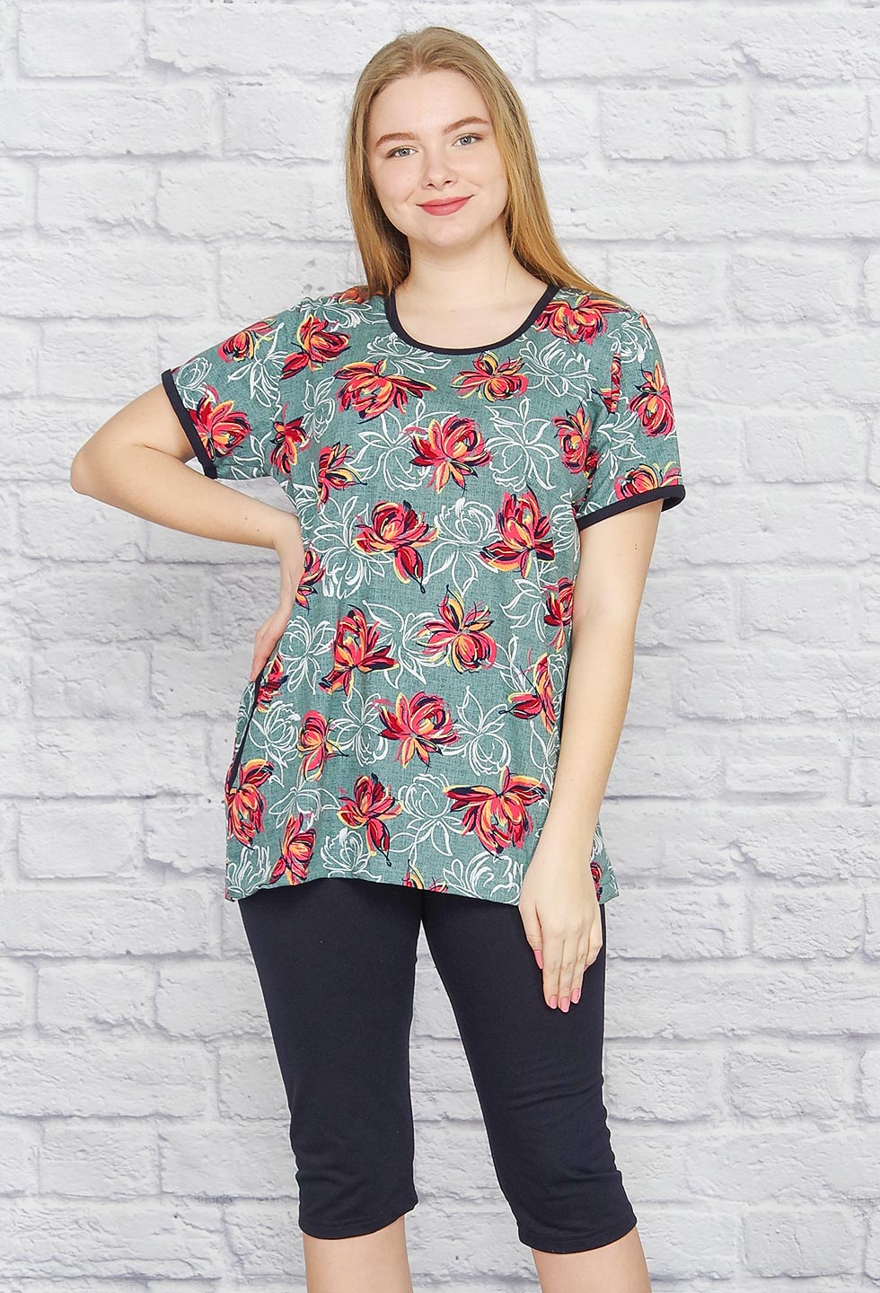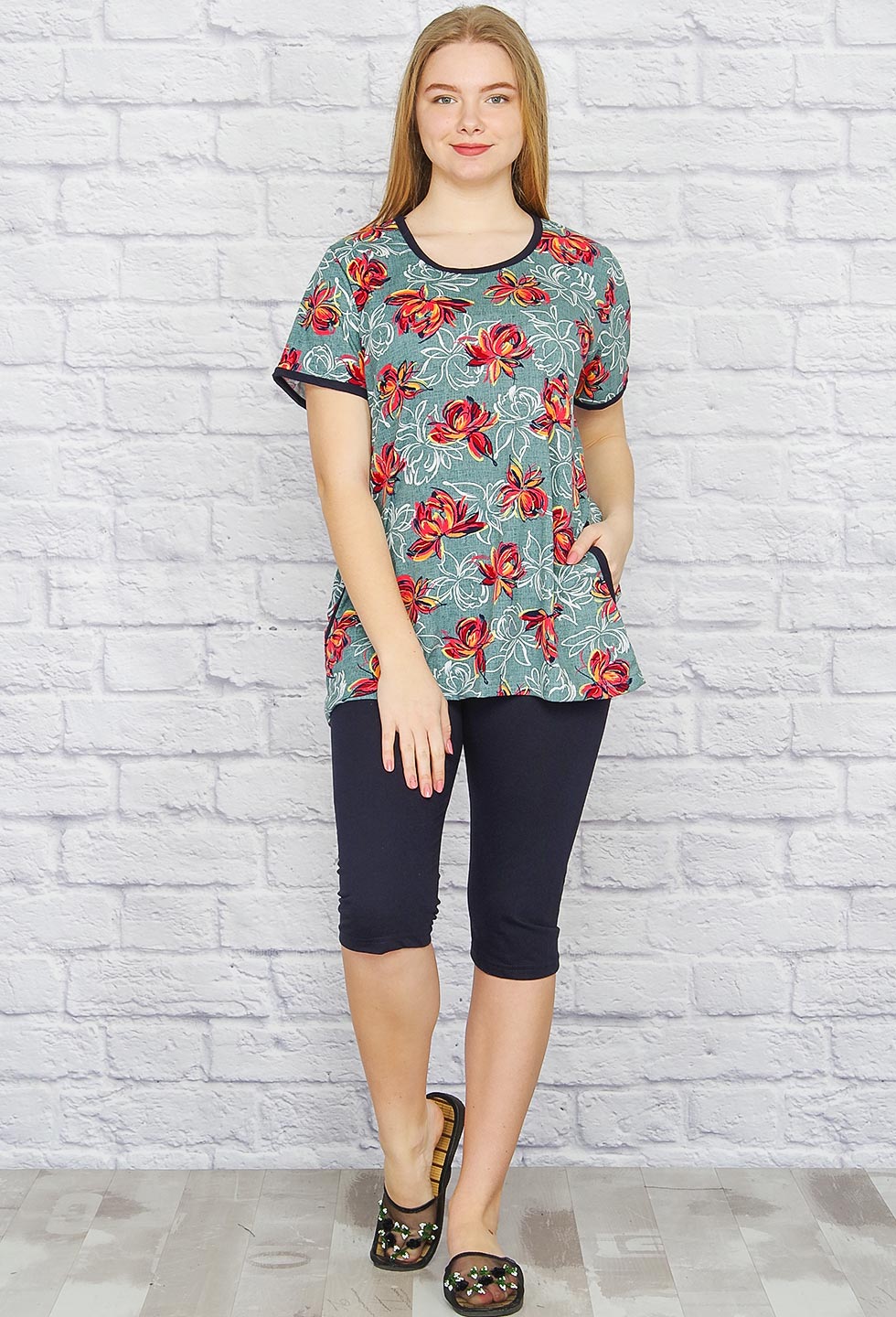 Лёгкий и удобный женский костюм для дома или дачи. Туника прямого кроя с боковыми карманами, рукав короткий, вырез горловины округлый. Бриджи удлинённые, пояс на резинке.