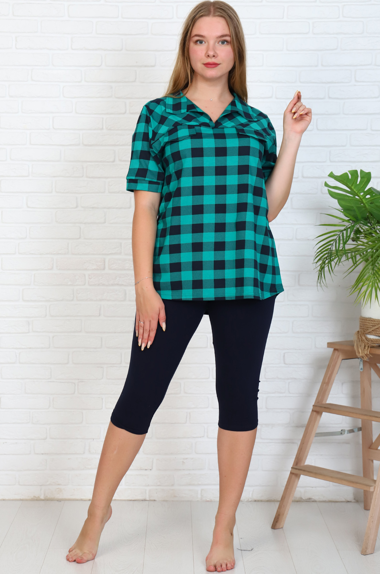 Удобный, стильный и невероятно женственный костюм для повседневного образа. Туника-рубашка с отрезной кокеткой и отложным воротником, на груди карманные клапаны. Модель с удлинённой спинкой. Бриджи облегающие, с комфортной посадкой, длина ниже колена, пояс на резинке.