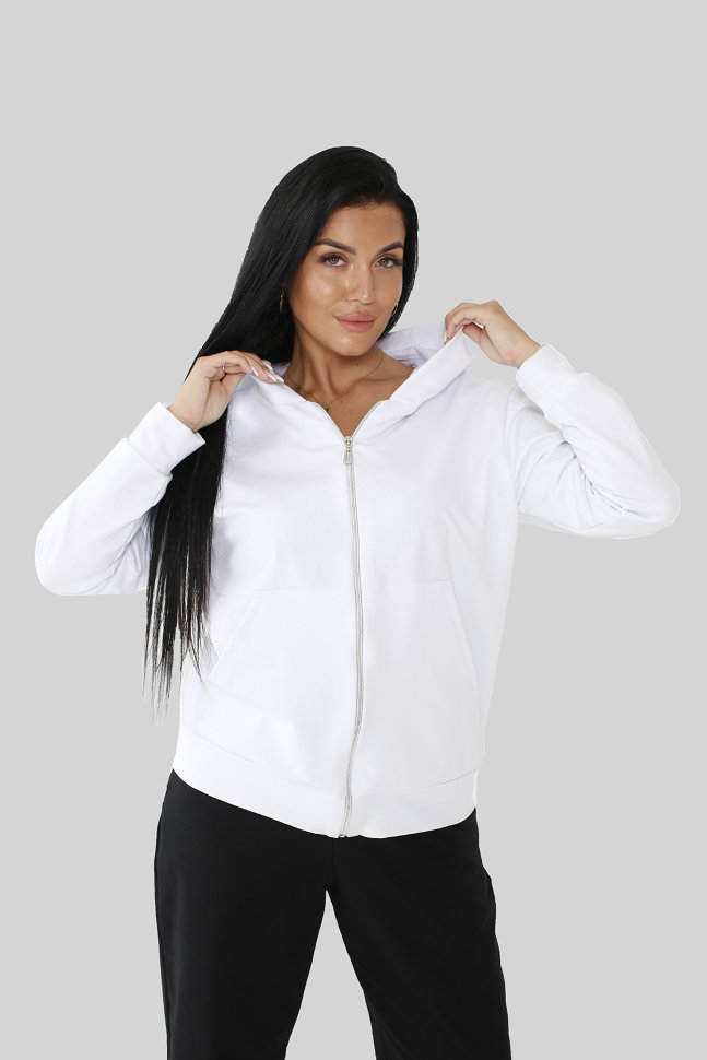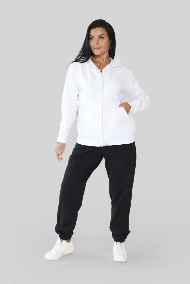 Костюм женский : черные классические брюки +белая кофта на молнии с капюшоном.