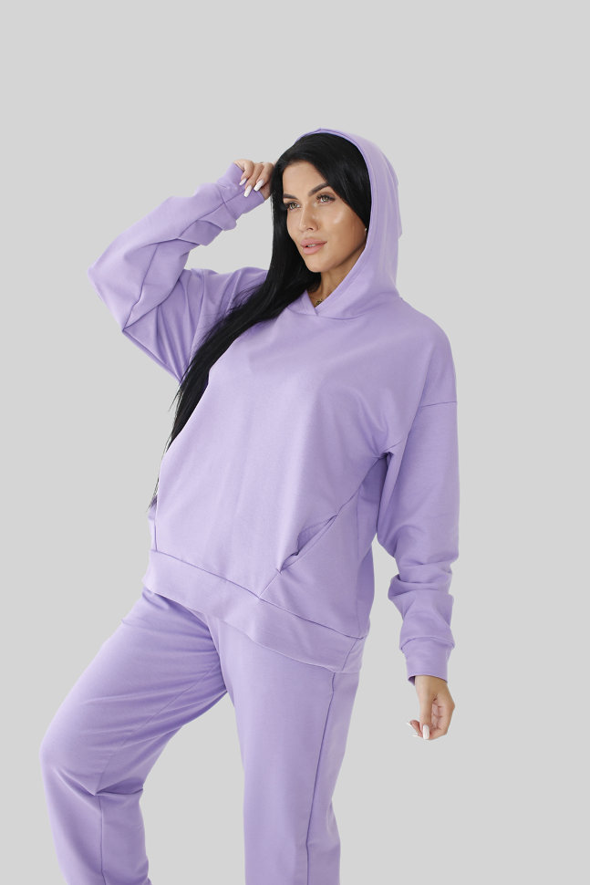Стильный женский костюм из футера с лайкрой, цвет "Фиолет", толстовка с капюшоном с прорезными карманами, рукав на манжете. Брюки классические , низ на резинке. Состав: футер 2 нитка однотонный(75% хлопок, 20% ПЭ, 5% лайкра). Размеры:46-56