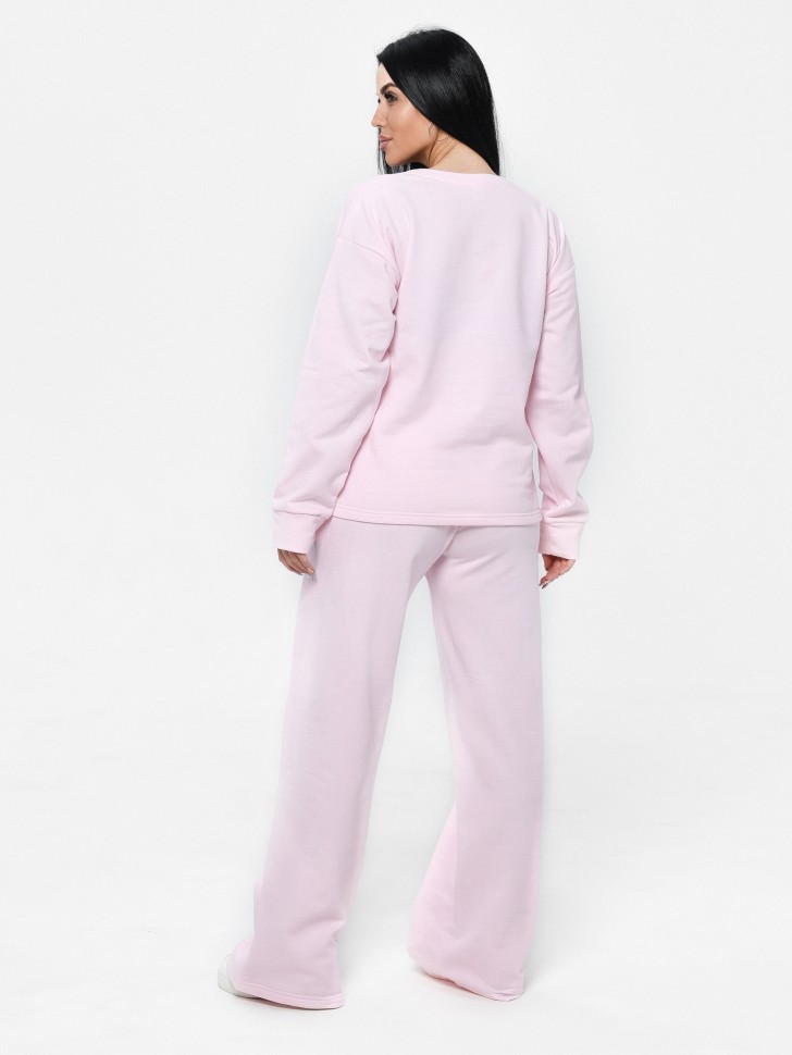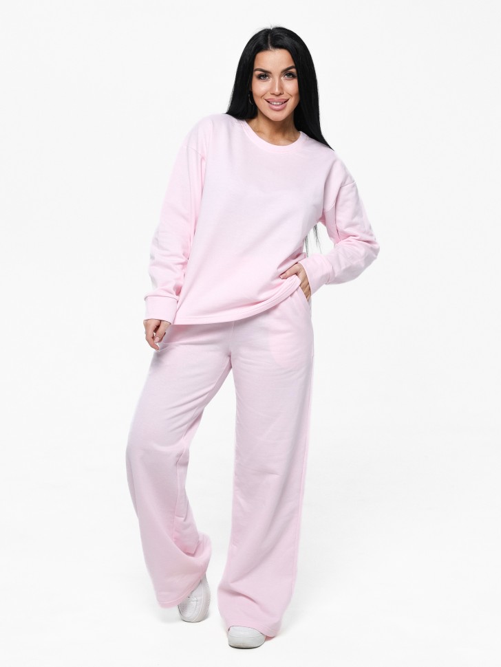 Домашний женский костюм из футера , цвет "Розовый", верx-свободный свитшот, рукав на манжете. Брюки расклешенные к низу с карманами в боковых швах  в стиле -палаццо.  Состав полотна : футер 2 нитка однотонный(80 % хлопок, 20% ПЭ). Размер: 42-60