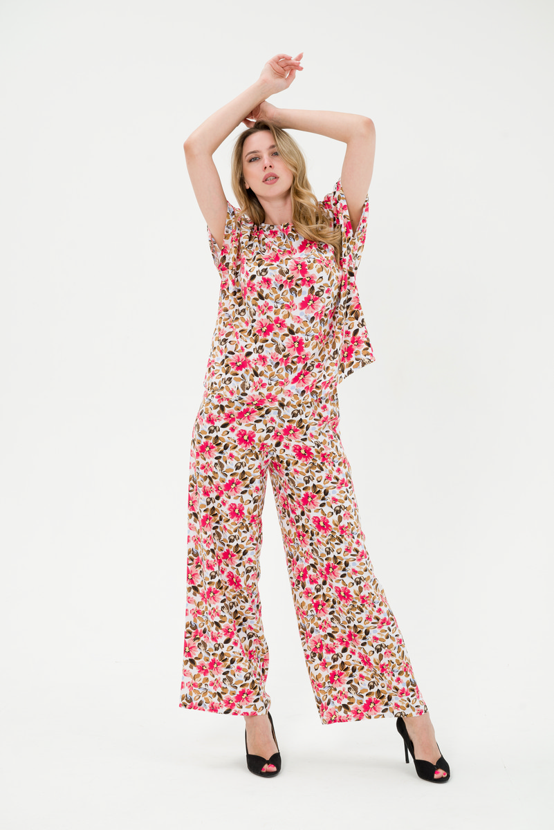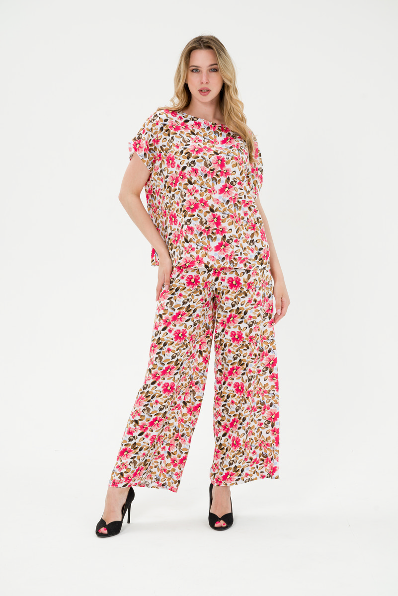 Костюм женский из туники и брюк штапель Диана цветы на белом
