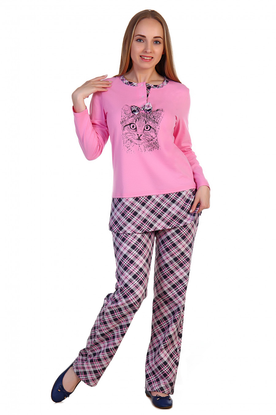Описание: Костюм состоит из блузы и брюк. Силуэт блузы прямой (длина спинки 72 см), длинные рукава, горловина круглая выполнена с обтачкой. Застежка-планка выполнена на кнопках и декорирована внизу отделочным бантиком. На передней части полочки расположена  печать методом шелкографии. Брюки прямые (длина 97 см.), пояс на резинке.