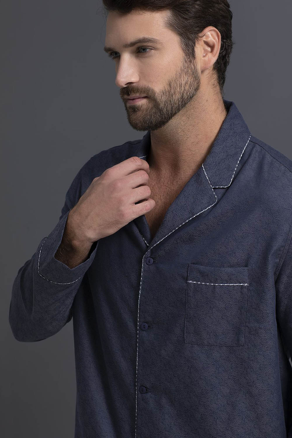 Рубашка для мужчин с длинным рукавами прямого кроя и английским воротником. Модель застегивается на пуговицы, имеет нагрудный карман. Края рубашки и широкие манжеты имеют окантовку. Фасон не стесняет движений и позволяет свободно двигаться, подходит для комфортного отдыха дома.