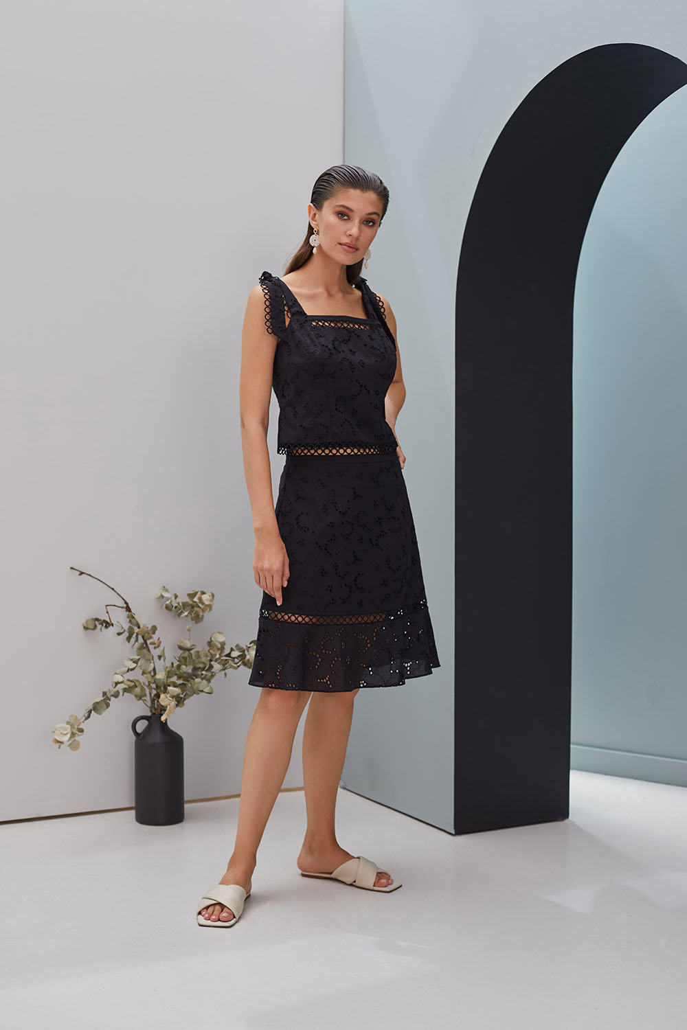 Черная юбка А-силуэта средней длины. Хлопковая ткань кроше с оригинальным флористическим рисунком в сочетании с дизайнерской тесьмой в виде колец создают неповторимый образ. Изделие отличается женственностью и утонченностью и подойдет, как для долгих летних прогулок, так и для вечерних свиданий.
