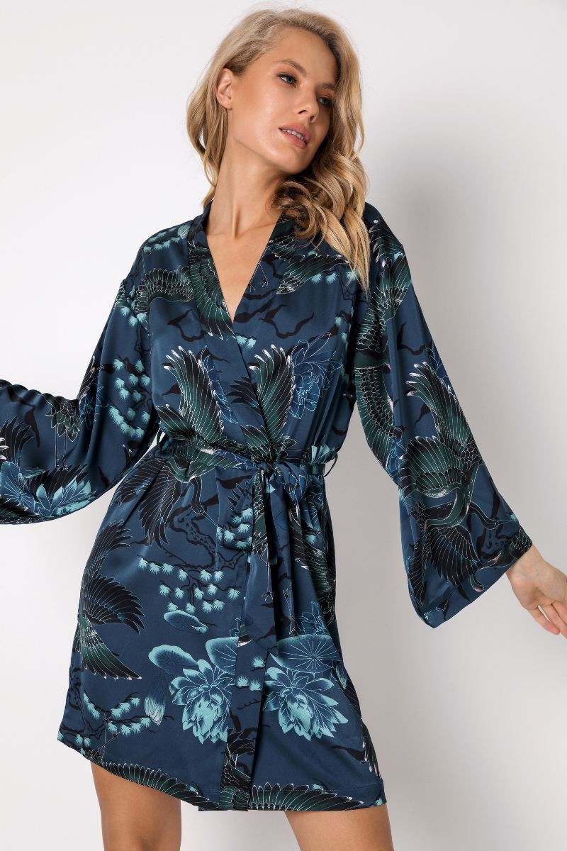 Шикарный халат выполнен из атласной ткани. Халат с поясом и внутренними завязками. Длина - выше колен. 96% полиэстер/ 4% эластан