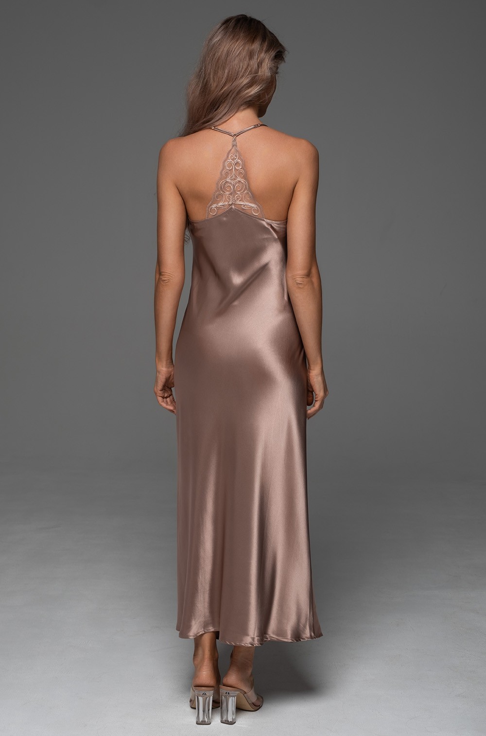 Длинная сорочка Mia-Amore на тонких регулируемых бретелях выполнена из однотонного смесового шёлка. Оригинальная спинка сорочки украшена вставками из кружева. По центру лифа украшение в виде бантика с подвеской.