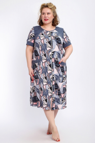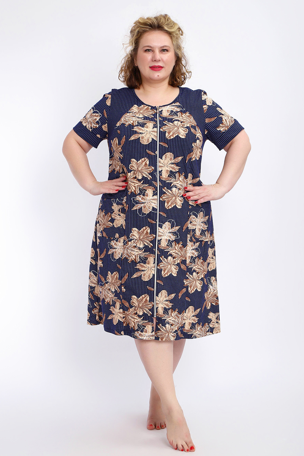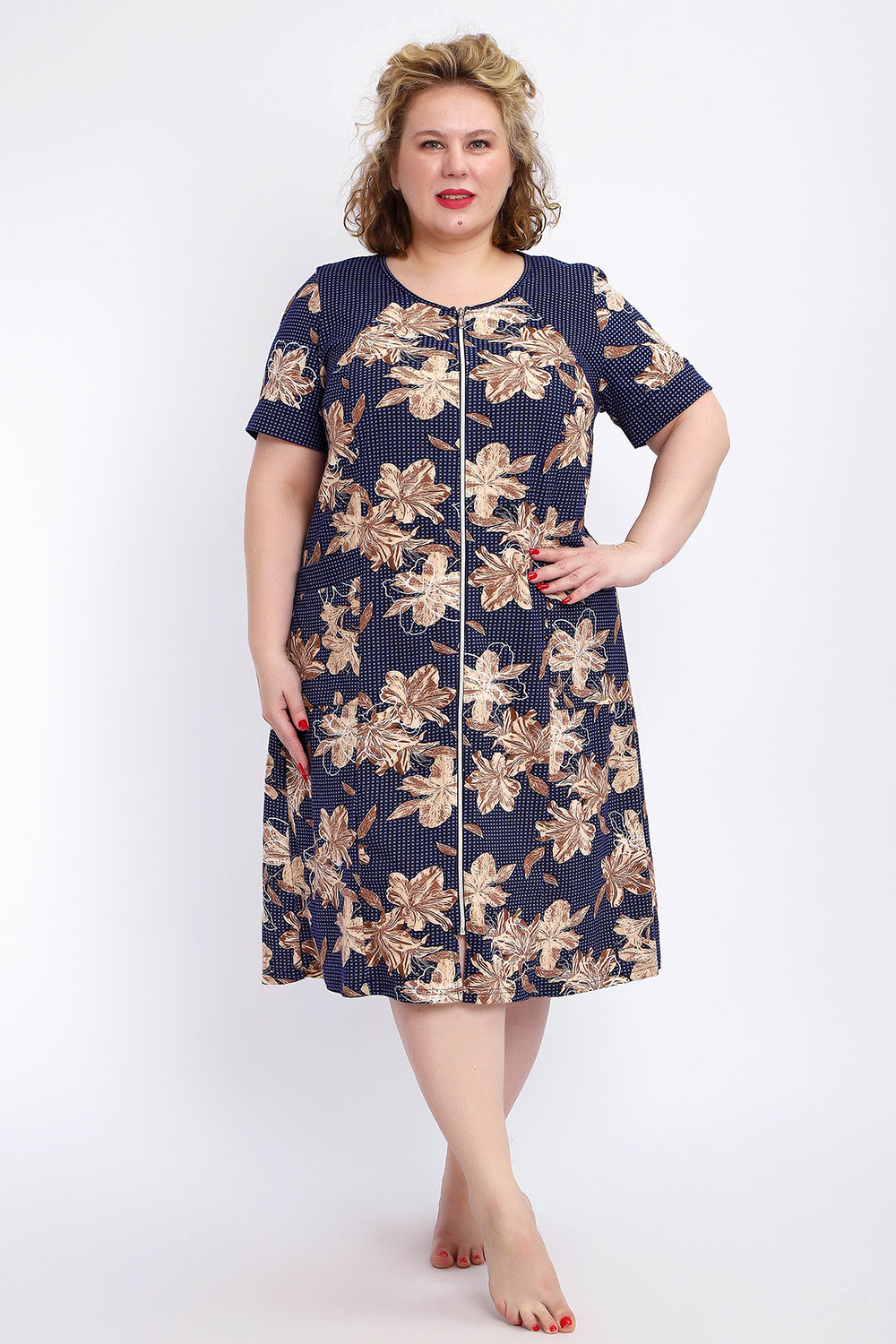 Ощутите домашний уют и комфорт - выбирайте халат женский домашний больших размеров из мягкой хлопковой ткани с очаровательным принтом. Халат на молнии является самой популярной моделью, обеспечивает удобство во время носки, не сковывает движений. Прямой свободный крой платья позволяет скрыть недостатки фигуры и ощущать легкость во время домашнего отдыха. Халат домашний дополнен накладными карманами и стильной круглой горловиной, которая оформлена декоративными планками. Длина платья универсальная, за колено. В наличии есть большие размеры, поэтому выбирайте такой халат в роддом. Изделие выглядит стильно и привлекательно за счет нежных светлых бутонов цветов на контрастном темном фоне. Женская домашняя одежда российского производства имеет идеальную посадку, не линяет, не дает усадку после стирки и долго сохраняет первоначальный внешний вид. Цвет: Розовый веер;лилии;Синий веер; Материал: кулирка;кулирка; Состав: 100 % хлопок.
