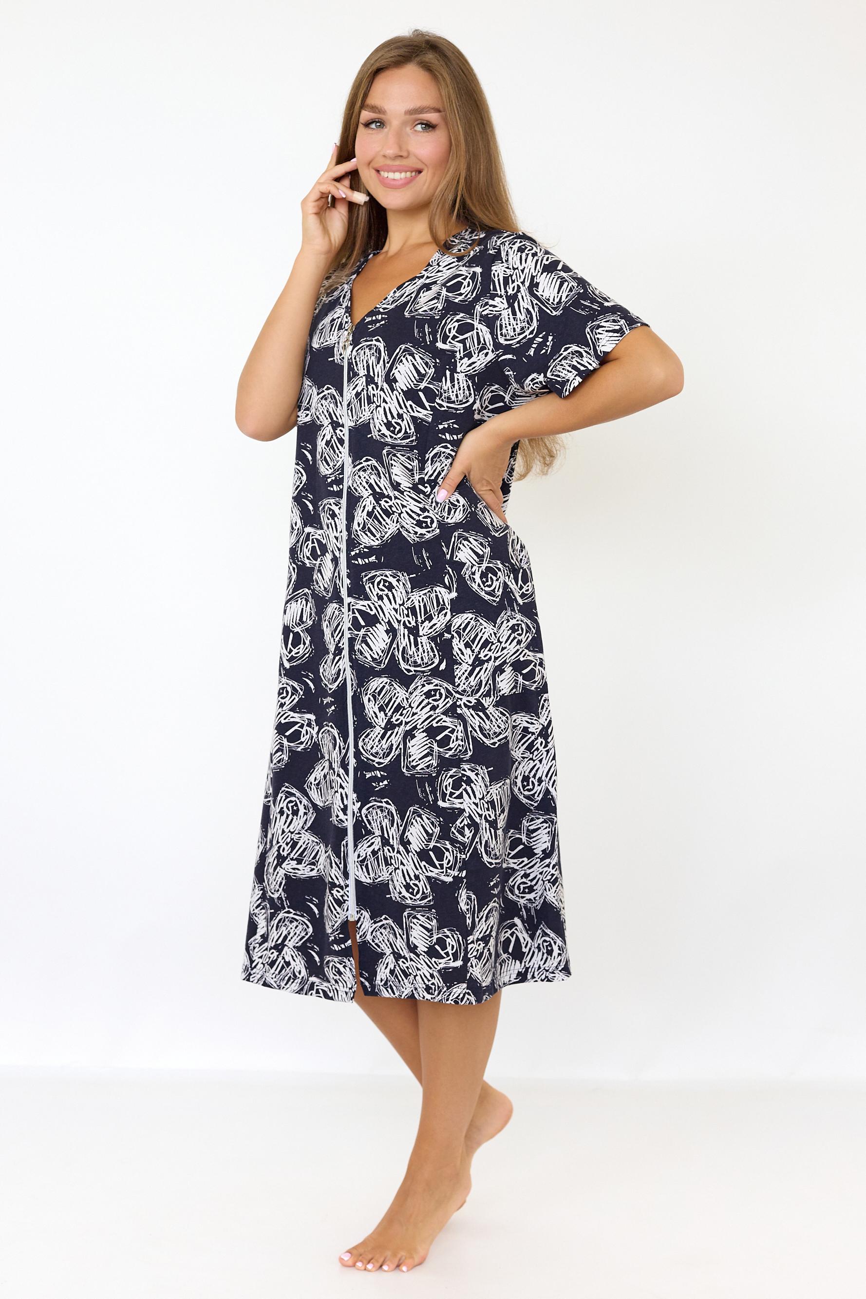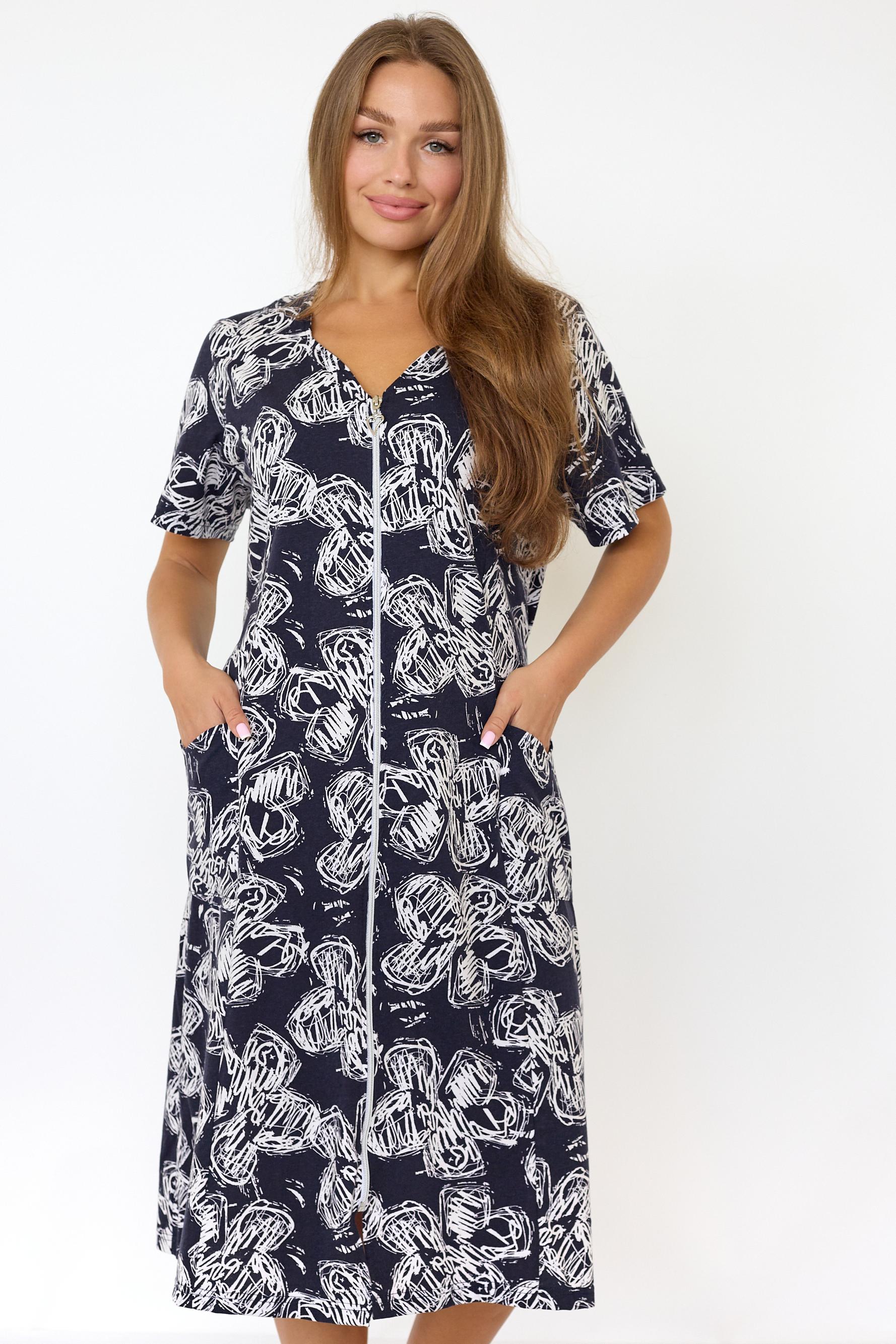 Лёгкий хлопковый домашний халатик с застёжкой на молнию и поясом на спинке. Красиво выполнен фигурный головой вырез. Короткий втачной рукав. Халат дополнен карманами для дополнительного удобства.