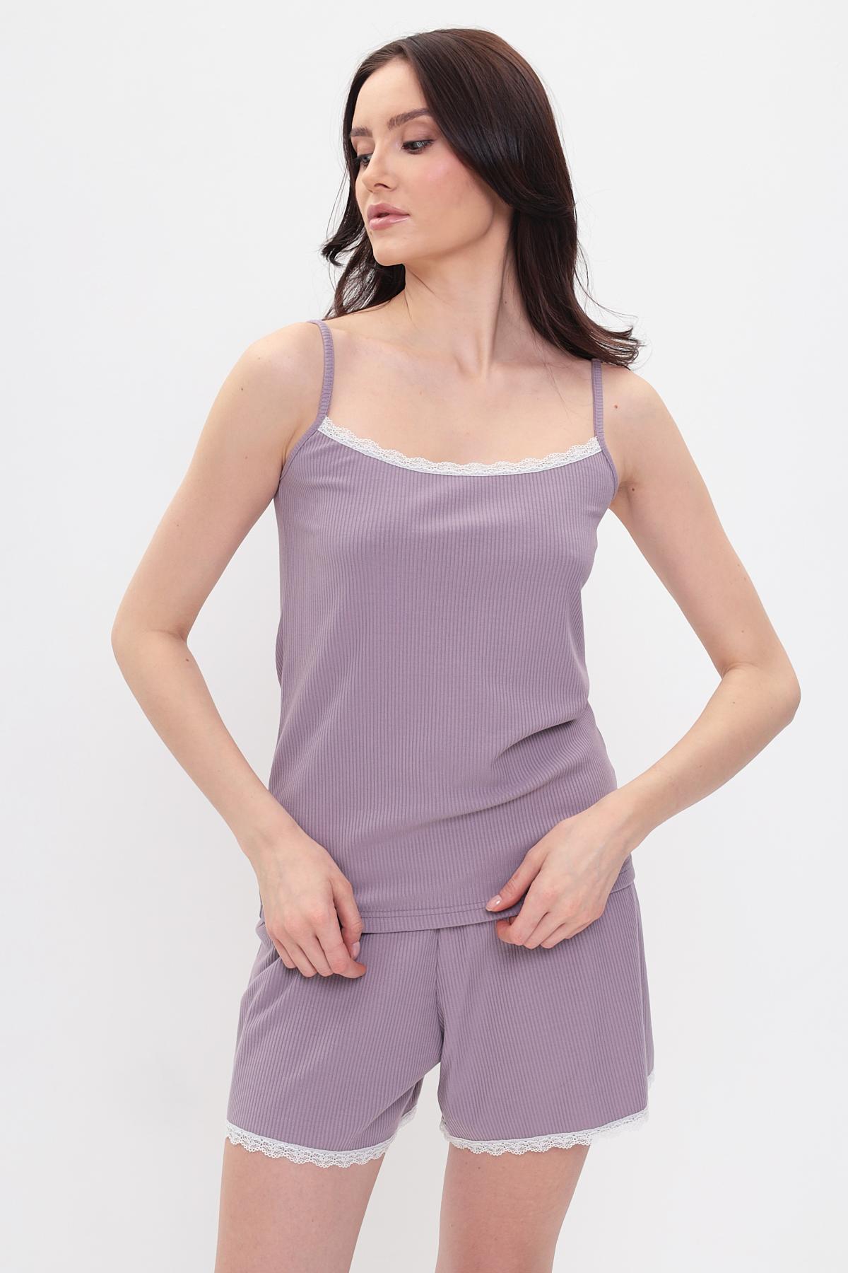 Милая женская пижама Алитея идеальна для отдыха и сна. Комплект состоит из майки и шорт, которые украшены по краю кружевом. Пижама подчеркивает фигуру, смотрится женственно и эстетично.Ткань в рубчик приятна к телу, не стесняет движений, проста в уходе.