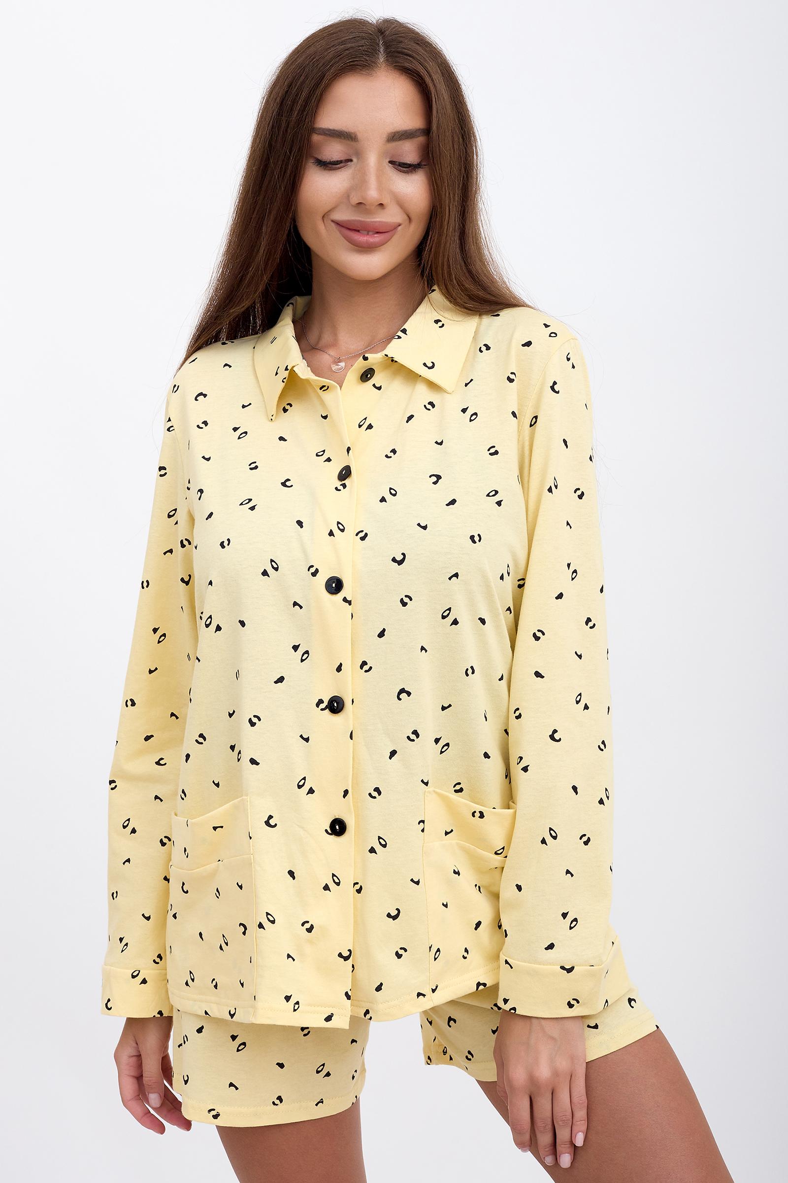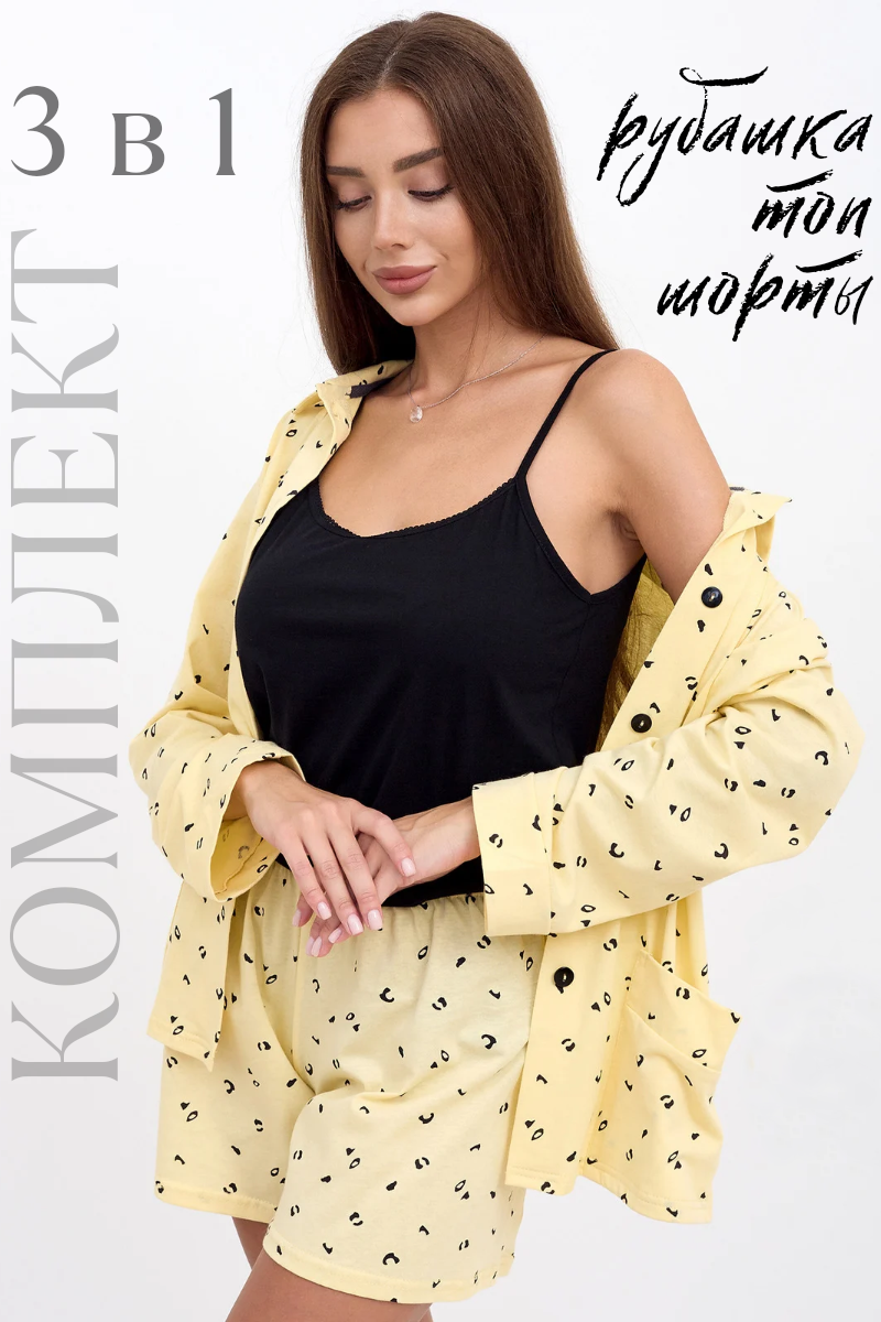 Универсальная женская пижама для отдыха и сна. Комплект тройка состоит из рубашки на пуговицах с карманами, черной майки и удобных шорт. В такой пижаме удобно ходить дома и заниматься домашними делами или просто отдыхать. Пижама может стать отличным подарком на любой праздник.