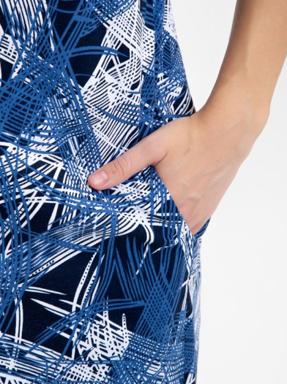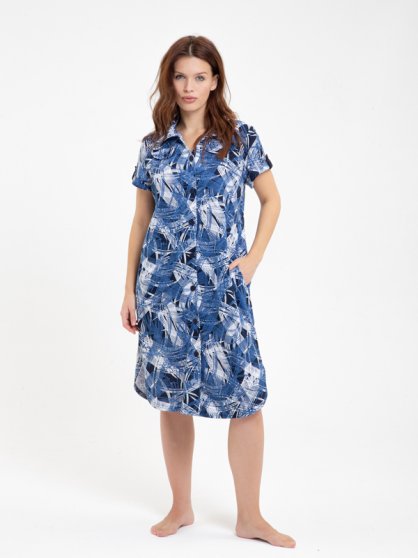 Оптовая продажа. Халат женский всесезонный, принтом по всему полотну, из трикотажного хлопкового полотна, прямой, средней длины, свободного силуэта, с короткими втачными рукавами с отворотом и декоративными пуговками, V-образным вырезом горловины, отложным воротником, центральной застежкой на пуговицы, боковыми карманами. Модель предназначена для повседневной носки дома. Удобный свободный крой дарит комфорт и ощущение свободы движений. Одежда из хлопка комфортна и приятна для кожи, дышащая и легкая, длительное время не разрушается под влиянием воды.