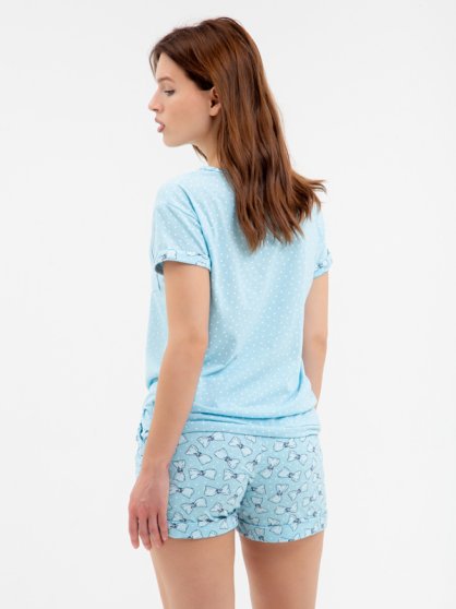 Оптовая продажа. Комплект женский из хлопкового полотна. Футболка прямая, свободного силуэта, с короткими слегка спущенными рукавами, круглым вырезом горловины, нагрудным кармашком, на завязках. Шорты укороченные, с подворотом, на резинке, с боковыми карманами.