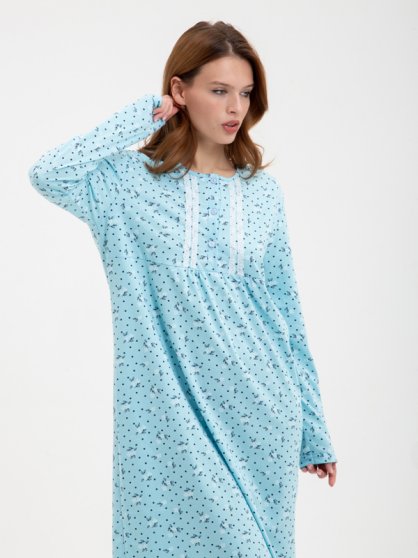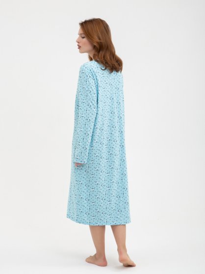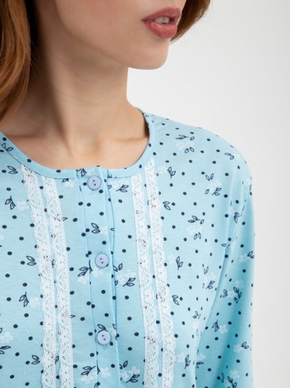 Оптовая продажа. Сорочка женская с цветочным принтом по всему полотну, из гладкокрашеного трикотажного полотна кулирная гладь, прямая, свободного кроя, длиной чуть ниже колена, с длинными втачными рукавами, U-образным вырезом горловины, с застежкой на пуговки. Сорочка декорирована кружевной тесьмой. Удобный свободный крой дарит комфорт и ощущение свободы движений. Одежда из хлопка комфортна и приятна для кожи, дышащая и легкая, длительное время не разрушается под влиянием воды. Рекомендуется бережная стирка при 30С.