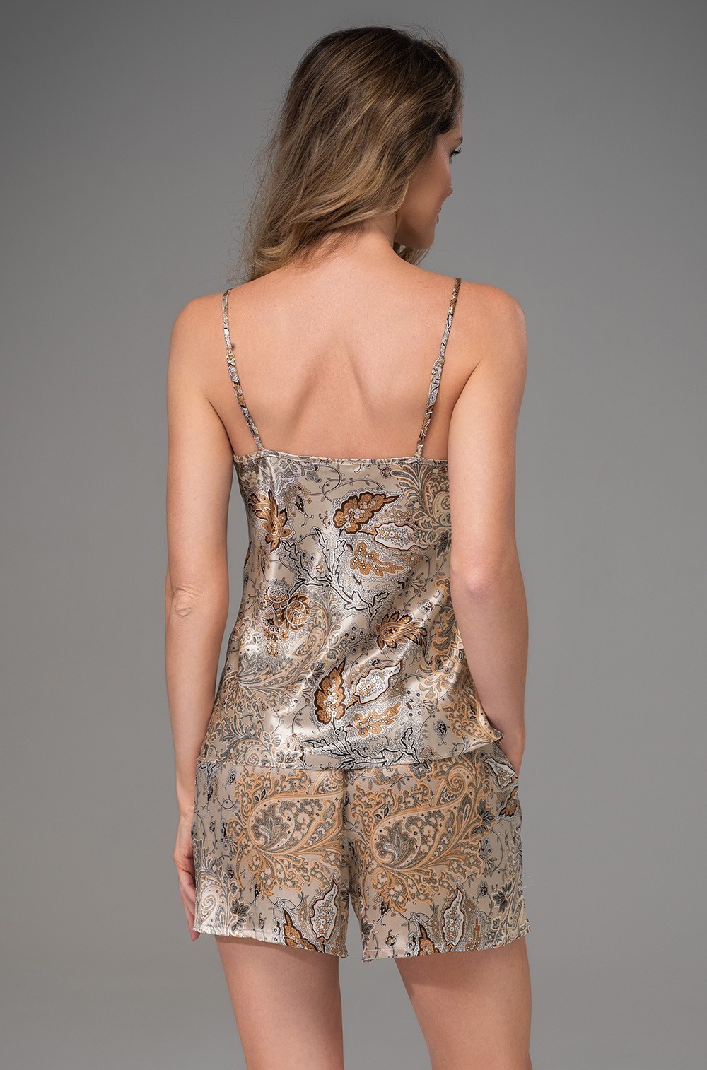 Комплект Mia-Amore из принтованного смесового шелка состоит из топа на тонких бретелях и шорт. Отделка лифа топа изящно декорирована контрастным кантом. По бокам шорт расположены карманы.